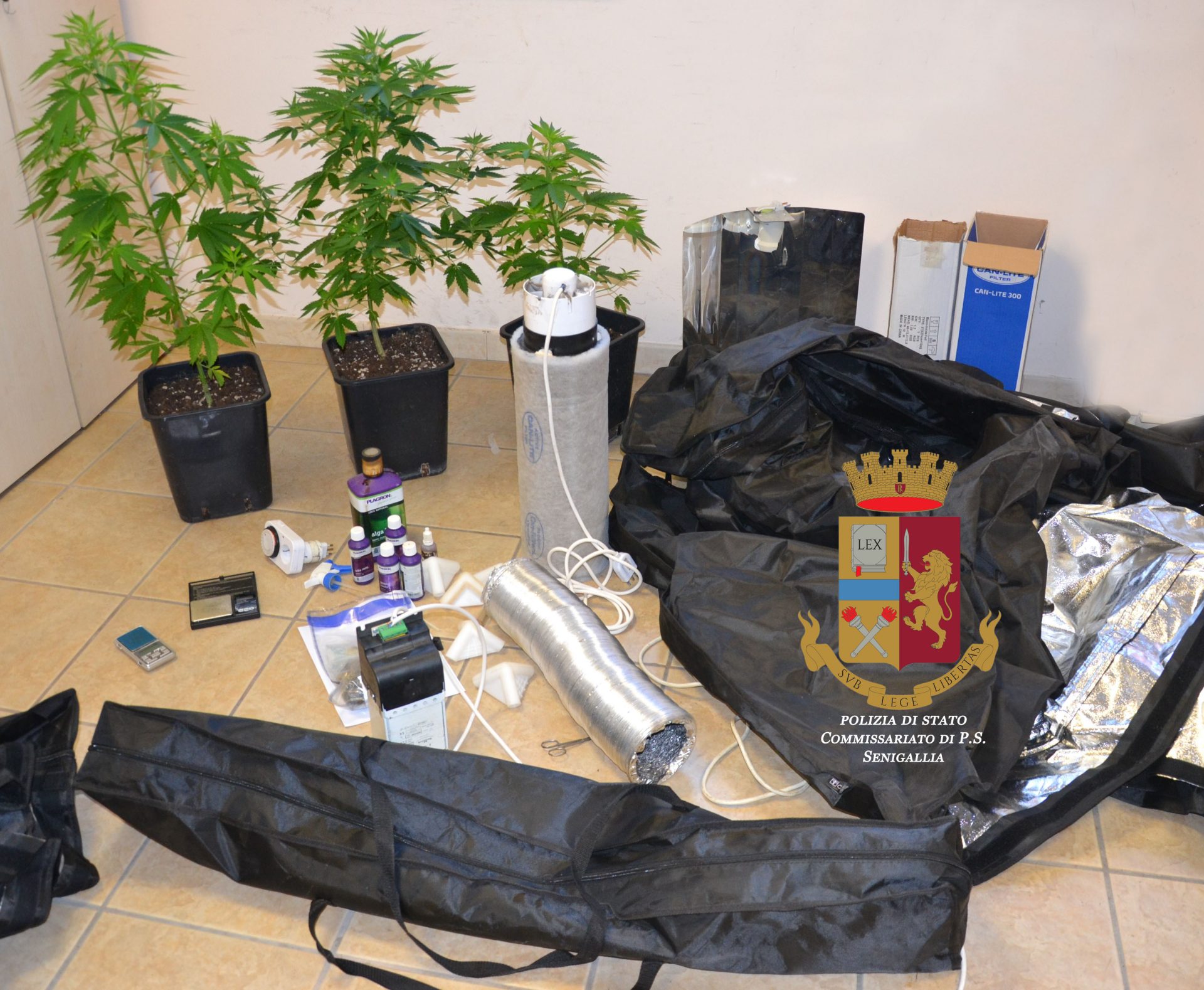 In particolare, i poliziotti hanno eseguito un controllo approfondito presso l’abitazione di un giovane senigalliese, poco più che 25enne, disoccupato. Questi, inizialmente negava di possedere sostanze stupefacenti poi, davanti ai poliziotti, è stato costretto ad ammettere di aver nascosto una busta piena di marijuana già essiccata e pronta per la cessione. Nell’occasione venivano trovati strumenti idonei al confezionamento. Ma gli agenti si sono ulteriormente insospettiti per il comportamento del giovane e, dalle ulteriori verifiche, hanno scoperto che, all’interno dell’abitazione, in una stanza, vi erano anche alcune piante di marijuana, giunte a diverso grado di maturazione, che lo stesso coltivava utilizzando i necessari prodotti. Inoltre il giovane era in possesso di tutta la complessa struttura idonea ad impiantare una coltivazione di cannabis -con tanto di telo oscurato, lampade UV, concimi e impianto di aerazione- in grado di produrre elevati quantitativi di sostanza stupefacente. I poliziotti del Commissariato di P.S. di Senigallia, dunque, procedevano a trarre in arresto il giovane per il reato di detenzione con fini di spaccio e coltivazione di sostanza stupefacente, sequestrando la sostanza e le piante trovate per un peso complessivo pari a circa 700 grammi. Il giovane, sottoposto agli arresti domiciliari, è stato poi condotto avanti al Giudice del Tribunale di Ancona per la convalida dell’arresto. Al termine del successivo giudizio direttissimo è stato condannato alla pena di un anno e quattro mesi di reclusione, con il sequestro della sostanza e di quanto utile alla coltivazione.