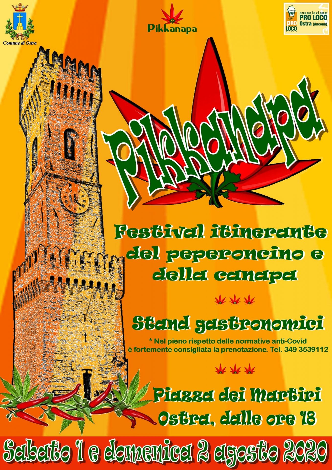 Prende il via da Ostra nel week-end “Pikkanapa – Festival itinerante del Peperoncino e della Canapa”, Piazza dei Martiri ad Ostra nei giorni 1 e 2 agosto. L’evento organizzato dal Comune di Ostra in collaborazione con l’Associazione Pikkanapa e con la Pro Loco di Ostra si ripete per il secondo anno sotto la Torre- fa sapere una nota stampa- visto l’ottimo consenso ottenuto la scorsa estate. «Torniamo molto volentieri ad Ostra e proprio da qui abbiamo deciso di far partire la nostra manifestazione itinerante per dare un segnale forte in questo momento di incertezza diffusa. Peperoncino e Canapa da sempre sono per noi due ingredienti trasversali che legano sviluppo economico, recupero e salvaguardia della tradizione italiana, promozione del benessere, buona gastronomia e promozione turistica; due elementi che, a maggior ragione oggi, possono costituire un punto di ri-partenza ideale», afferma il Presidente di Pikkanapa Leonardo Brunzini. Il menù della cena parte dallo spezzatino di vitello con salsa piccante fino all’hamburger con semi di canapa, passando ovviamente per un ricco panino vegetariano. La prenotazione è fortemente consigliata per permettere di rispettare nel migliore dei modi le norme legate al distanziamento sociale, basta telefonare al 349 35 39 112. Tutte le serate saranno accompagnate da un sottofondo live particolarmente originale: sabato 1 agosto ascolteremo sonorità balkaniche con la Familja Iljazi mentre Domenica 2 agosto sarà la volta della musica d’autore dei Cantori Animati. In programma insomma una ricca offerta per i visitatori: gastronomica, con la possibilità di degustare sfiziose pietanze piccanti abbinate a semi, farine e bevande a base di canapa, e commerciale, con espositori che propongono una serie di prodotti che spaziano dall’alimentare, al tessile fino alla cosmetica.