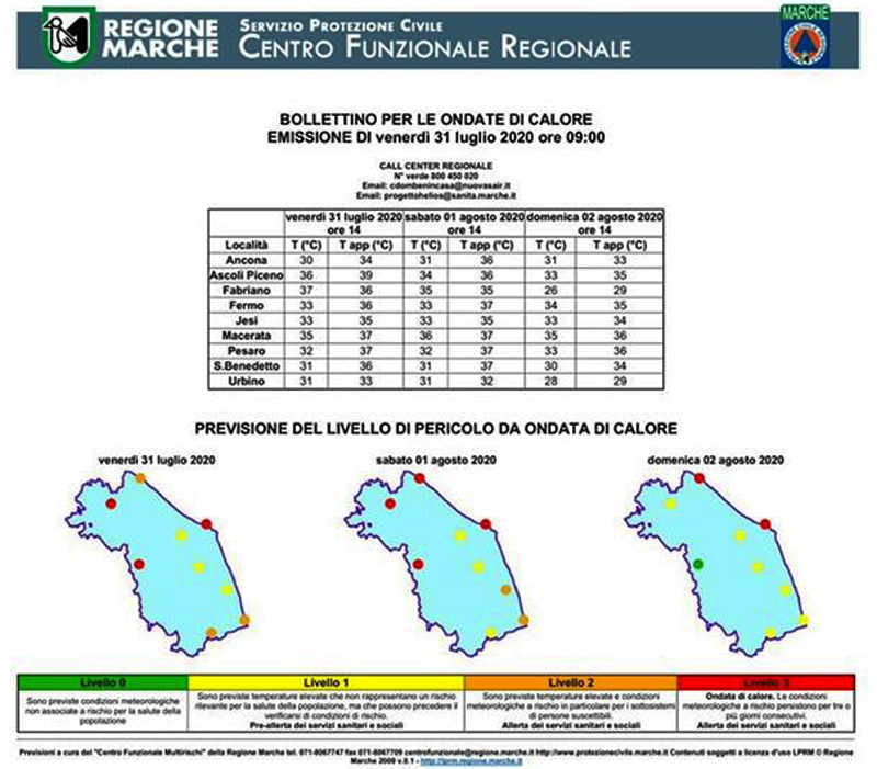 Giornata da bollino rosso per l’ondata di caldo ad Ancona, inserita, tra oggi e domani, nell’elenco delle 14 città italiane con le temperature più alte. Quelle percepite supereranno i 36 gradi. Lo comunica il centro funzionale della Regione Marche. Non andrà meglio nell’entroterra, dove, soprattutto a Fabriano la colonnina di mercurio, nelle ore più calde della giornata potrà superare i 35 gradi sotto la cappa di afa dell’Anticiclone Africano. Nel dettaglio per oggi è previsto un livello di pericolo di livello 3 (bollino rosso) nelle città di Urbino, Pesaro, Fabriano e Ancona. Bollino arancione (livello di pericolo 2) invece a Fermo e S. Benedetto del Tronto. Domani, domenica 2 agosto, il cielo continuerà ad essere sereno o poco nuvoloso ma nel corso del pomeriggio alcune velature potranno interessare la fascia costiera delle Marche mentre nelle ore centrali della giornata potrebbero verificarsi locali rovesci o temporali sui settori montani ed alto-collinari. Lunedì 3 agosto, invece annuvolamenti all’orizzonte con temperature in lieve diminuzione e temporali.