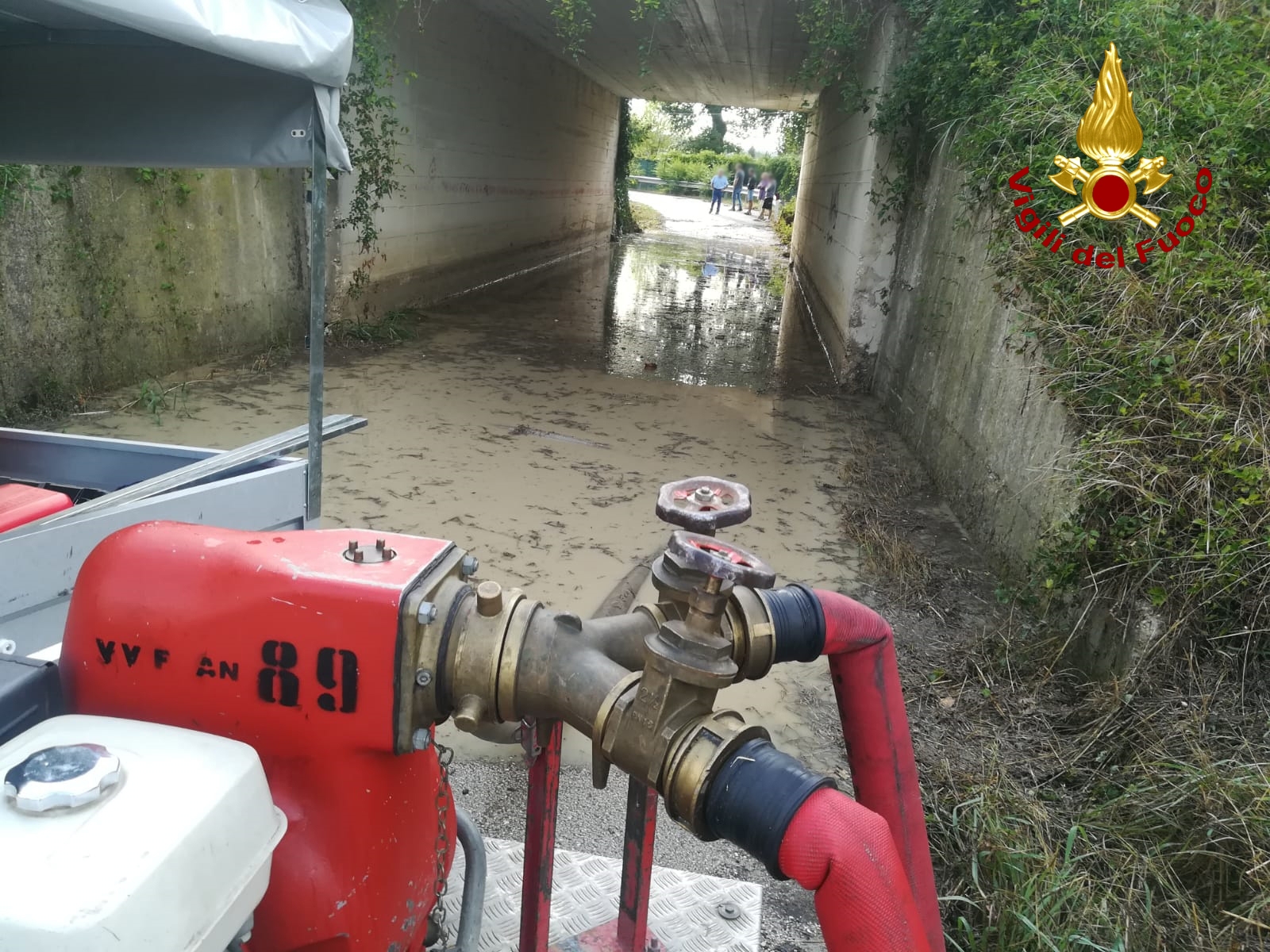 L’intervento per il prosciugamento dei sottopassi allagati a Jesi in cui diverse famiglie sono rimaste isolate nella zona del canile comunale