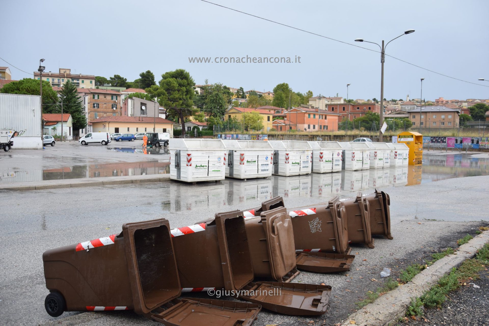 Ribaltati dal vento anche tutti i cassonetti dell’immondizia.