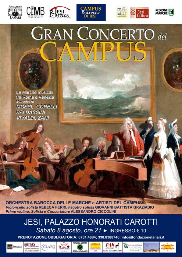 TRA ROMA E VENEZIA- Con il titolo “Gran concerto del campus – Le Marche musicali tra Roma e Venezia”, la serata propone musiche di Mossi, Vivaldi, Baldassini, Zani, Corelli, guardando ai poli musicali primari dell’epoca –Venezia e Roma- dal punto di vista delle Marche, centrale geograficamente tra di essi e ad essi molto legate per frequentazioni artistiche e influssi culturali. Un evento di grande rilievo non solo artistico e spettacolare, ma anche di carattere e richiamo musicologico, perché recupera alla modernità un autore marchigiano dell’epoca al tempo importante e oggi pressoché dimenticato, rilanciando l’attenzione sul profondo legame musicale e culturale tra la regione e la sua capitale dell’allora Stato Pontificio.