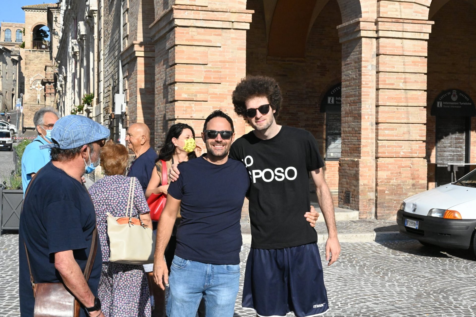 OSIMO - Foto ricordo, abbracci e congratulazioni stamattina in piazza Boccolino per il giovane esponente di 'Osiamo' prima della partenza con gli amici alla volta di Riccione per l'addio al celibato