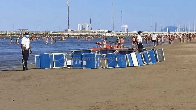 Il corpo dell’uomo in spiaggia, coperto dai lettini