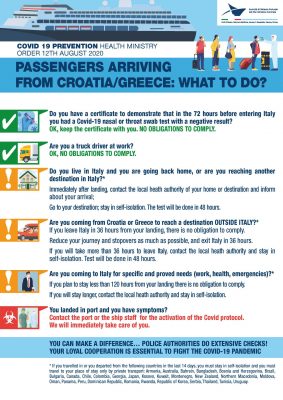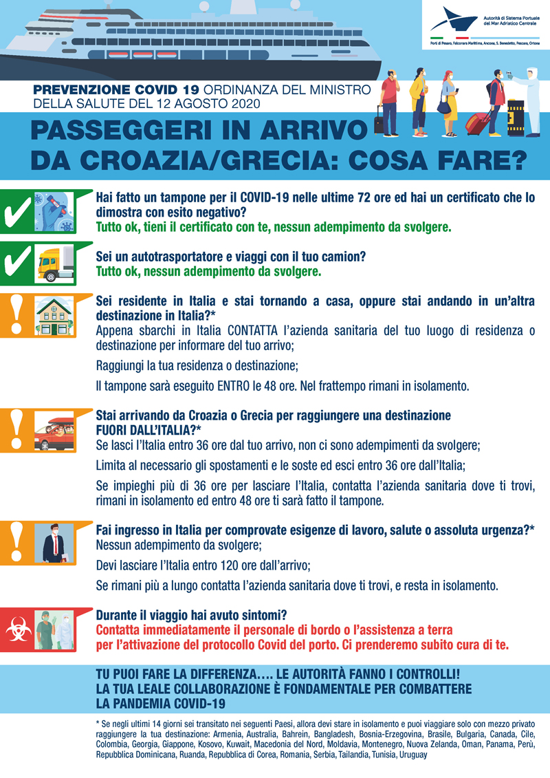 Il costante contatto con le autorità sanitarie – Asur e sanità marittima – e le forze dell’ordine ha confermato il modello operativo adottato dal porto di Ancona dal giorno successivo all’ordinanza: intanto tamponi in porto per chi durante la navigazione abbia manifestato sintomi da infezione di Coronavirus. In questo caso, come già sperimentato, si attiva il protocollo Covid del porto con l’attivazione di spazi dedicati e separati e le verifiche sanitarie svolte in collaborazione con l’Azienda sanitaria di Torrette fino al completo accertamento dello stato di salute del passeggero. E poi una capillare informazione per tutti gli altri viaggiatori in arrivo con l’indicazione delle misure da seguire per chi è diretto ad una destinazione in Italia: avviso immediato alle autorità sanitarie del luogo di residenza o destinazione; viaggio di rientro e isolamento fiduciario una volta a destinazione fino all’esecuzione del tampone obbligatorio entro 48 ore dalla dichiarazione alle autorità sanitarie. Inoltre vengono fornite informazioni anche a tutti i passeggeri diretti all’estero e agli autotrasportatori.