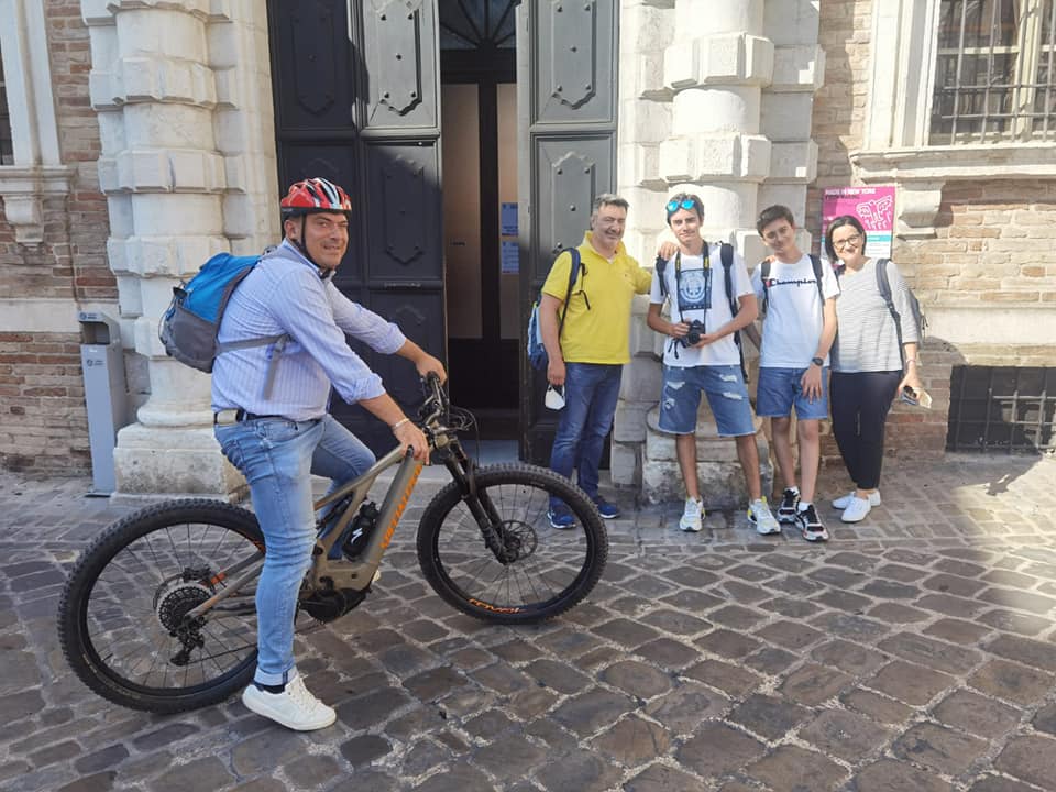 Il sindaco Simone Pugnaloni in bici con i blogger del Social Media Team della Regione Marche davanti a palazzo Campana che ospita la mostra di Keith Haring