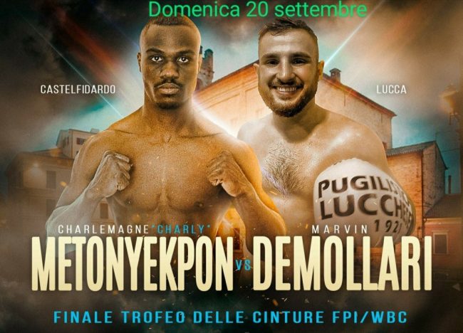 Dopo due rinvii dovuti all’emergenza covid, la finale del Trofeo delle Cinture Wbc Fpi dei pesi leggeri tra i pugili professionisti Charlemagne Metonyekpon (Marche) vs Marvin Demollari (Toscana), è stata fissata per domenica 20 settembre dalle ore 14,30 a Castelfidardo.