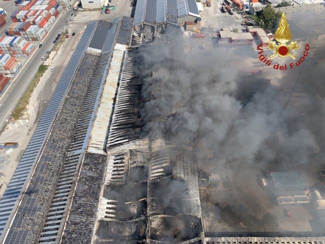 L’entità dell’incendio: l’area dell’ex Tubimar ha 45.891 metri quadrati coperti, suddivisi in 12 capannoni e ulteriori due strutture adibite a palazzine uffici, non coinvolte nell’incendio. Sono 11 i concessionari operativi nella struttura. Sette hanno in concessione aree all’interno dei capannoni per una superficie totale di circa 36.091 metri quadrati: tre società avevano depositi per attività logistiche (Ase, Frittelli Marittime Group, Icop); tre depositi per la cantieristica navale (Fincantieri, Cpn, Consorzio navale scarl); un deposito per mezzi di sollevamento e piattaforme mobili (Omec). L’incendio ha danneggiato in particolare i capannoni in concessione ad Ase e Frittelli Maritime Group.