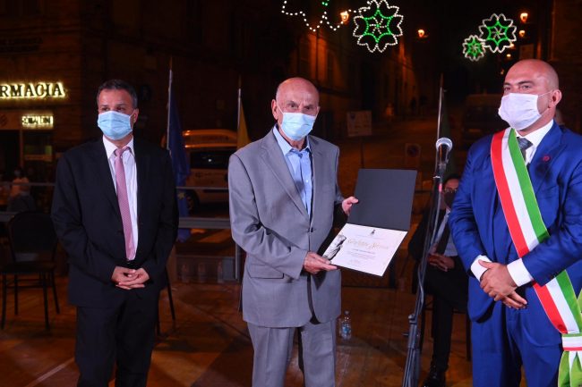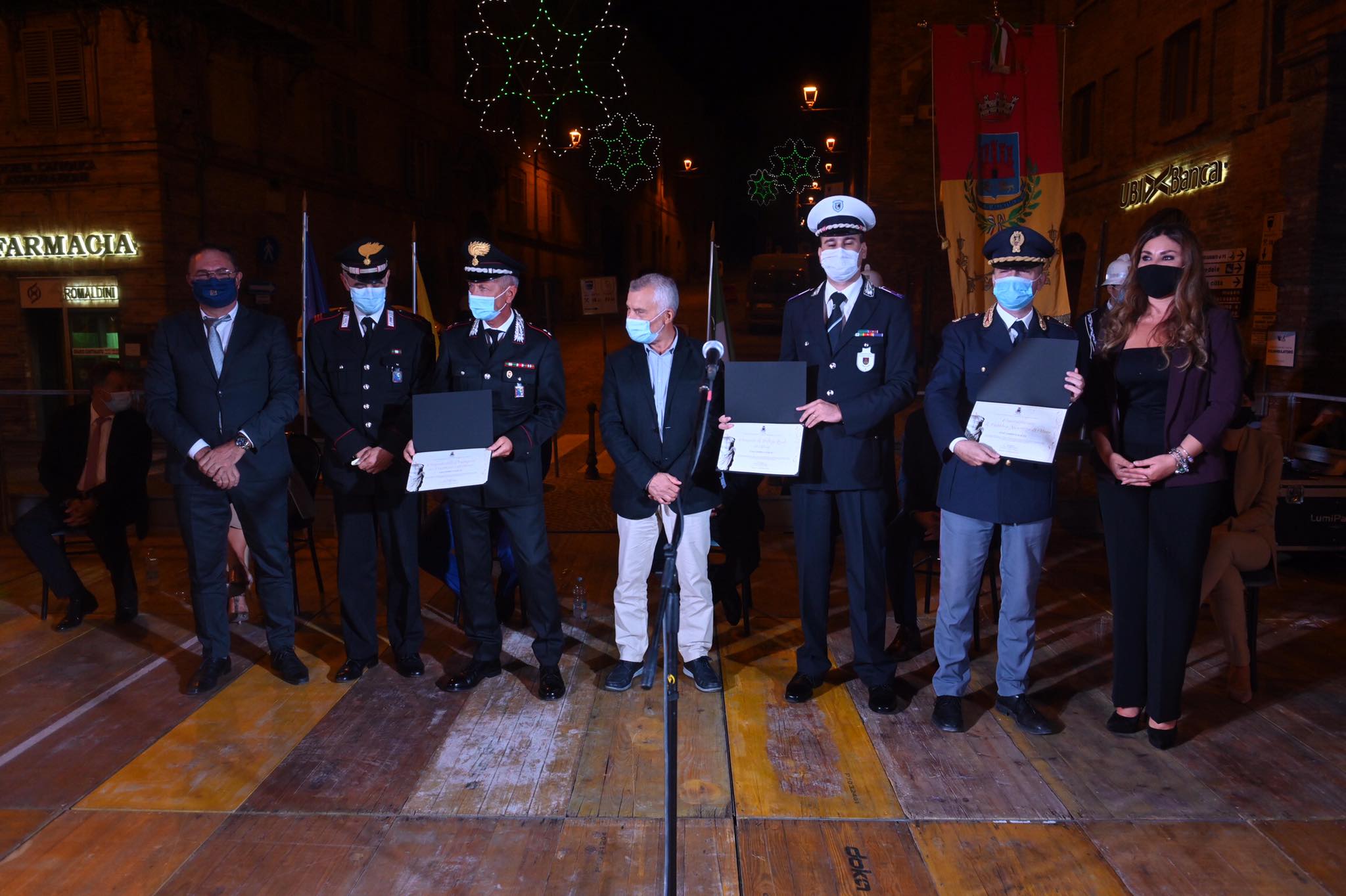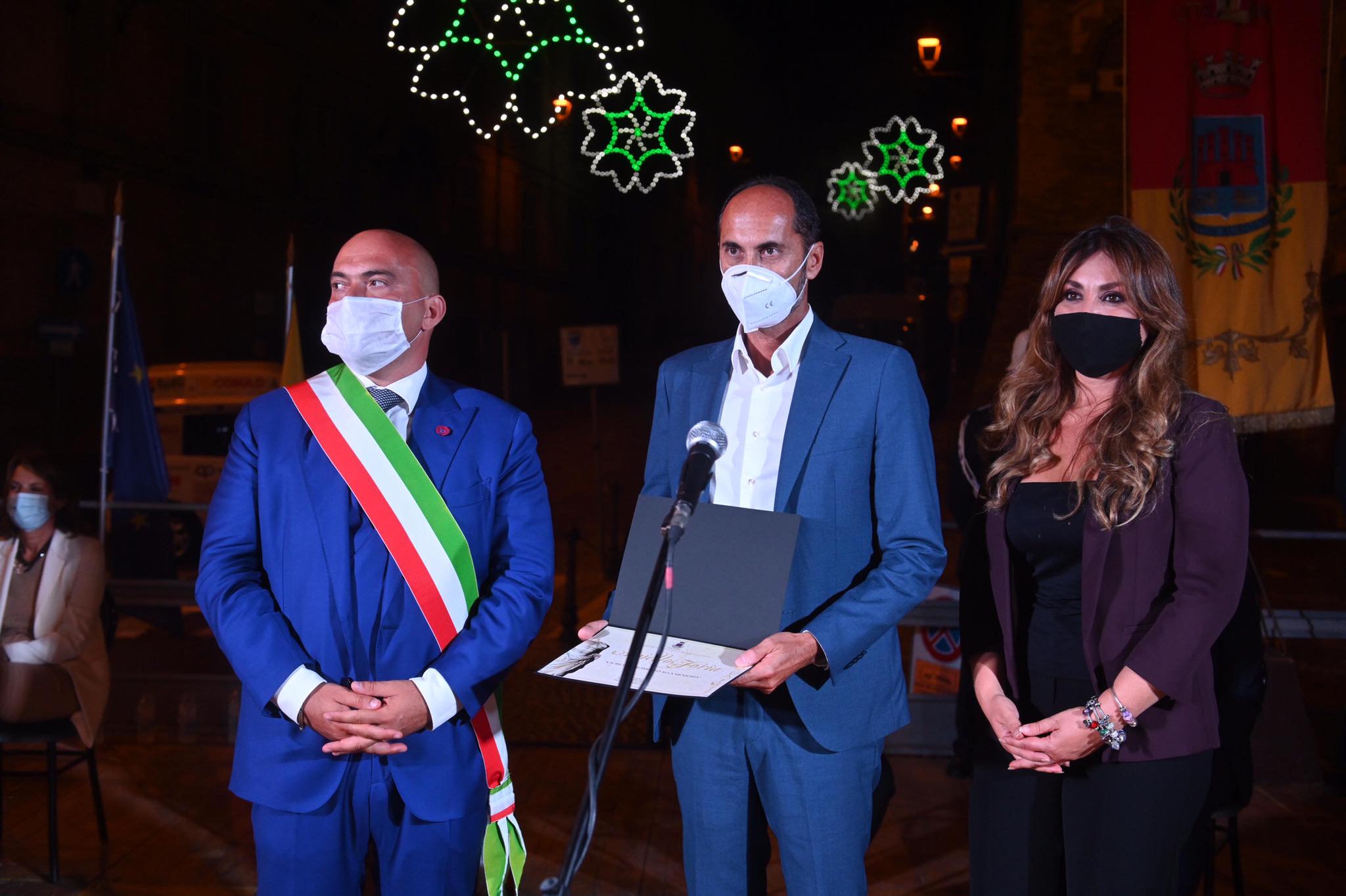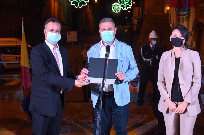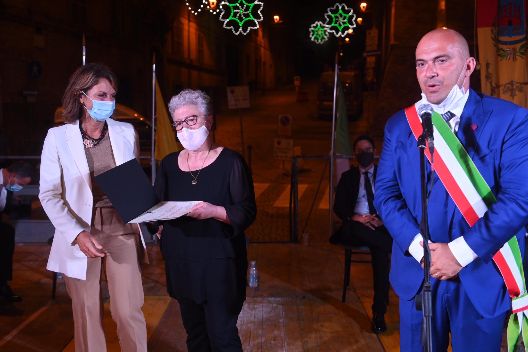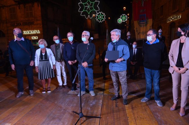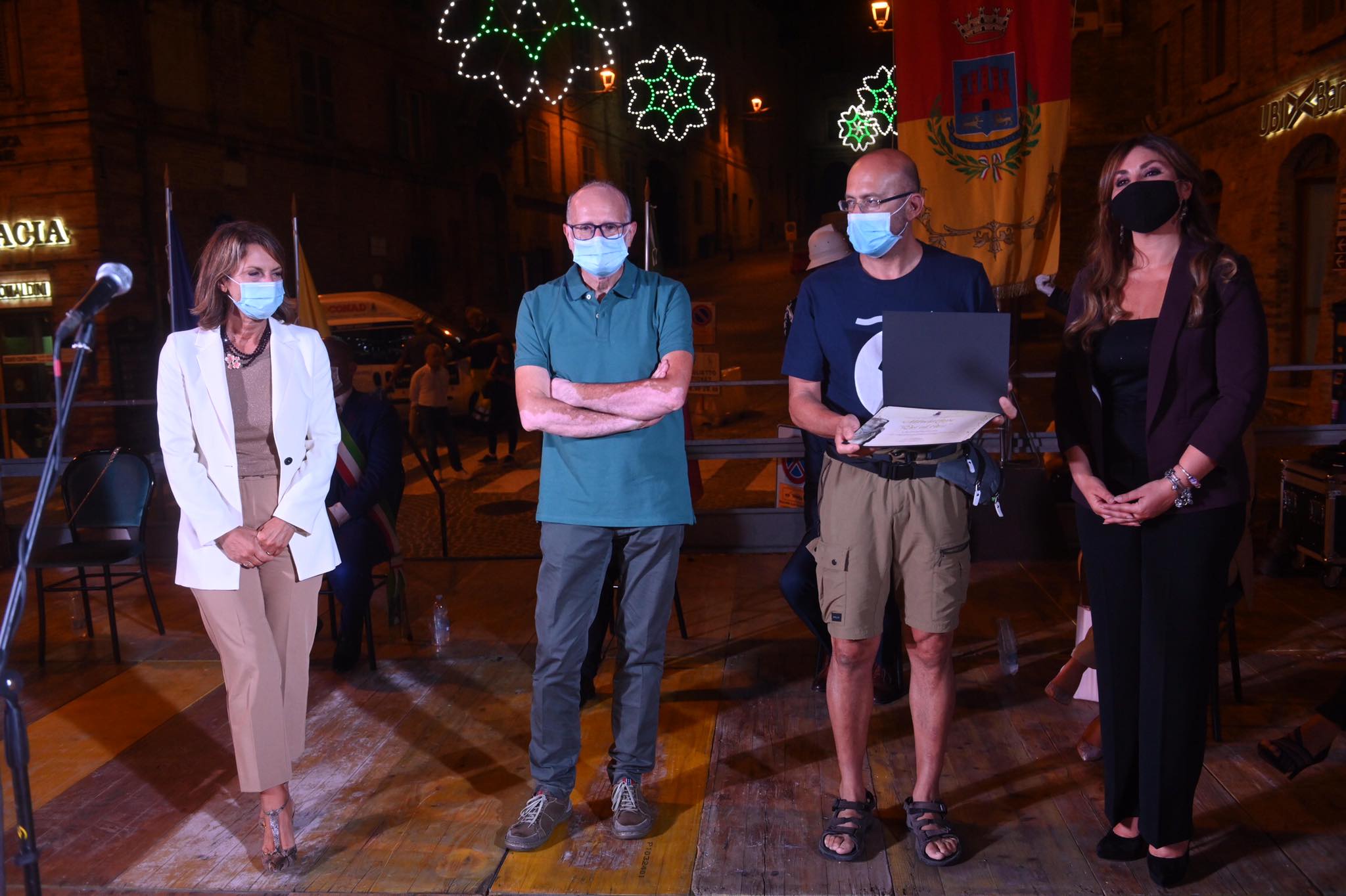 Ieri sera, sul palco di piazza del Comune tra un pubblico in assetto anti Covid, il sindaco Simone Pugnaloni, gli assessori e il presidente del Consiglio hanno consegnato i riconoscimenti ai protagonisti che hanno omaggiato il nome di Osimo (al link l’elenco dei premiati). Tra applausi e ricordi, è scattata la commozione alla lettura della lettera scritta dai familiari di Andrea Rocchi, deceduto a marzo a Cingoli, ai quali è stata consegnata una pergamena alla memoria. Un messaggio d’affetto della compagna del 40enne, letto dall’assessore Michela Glorio.