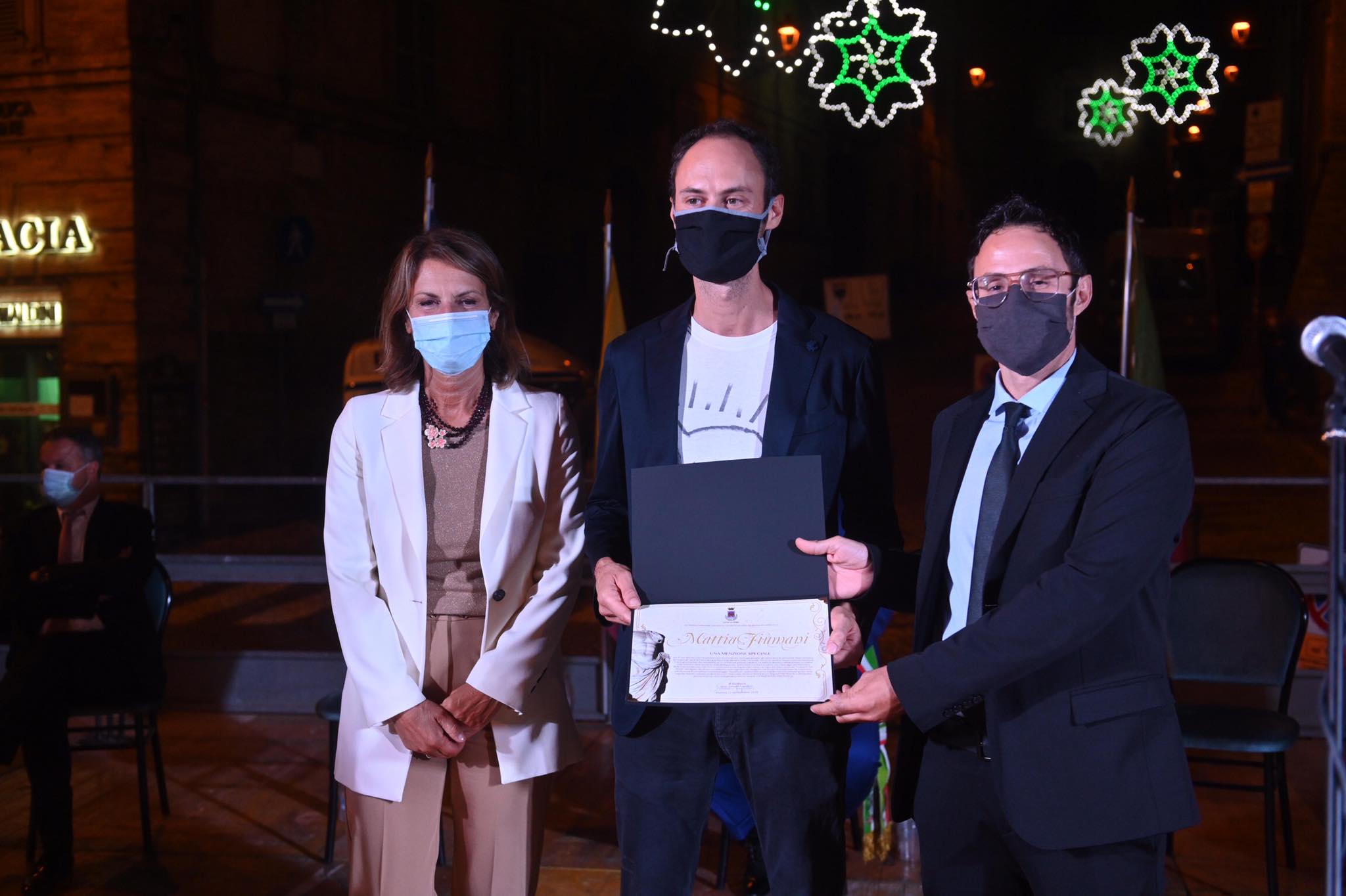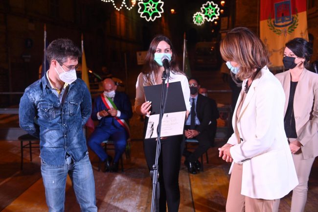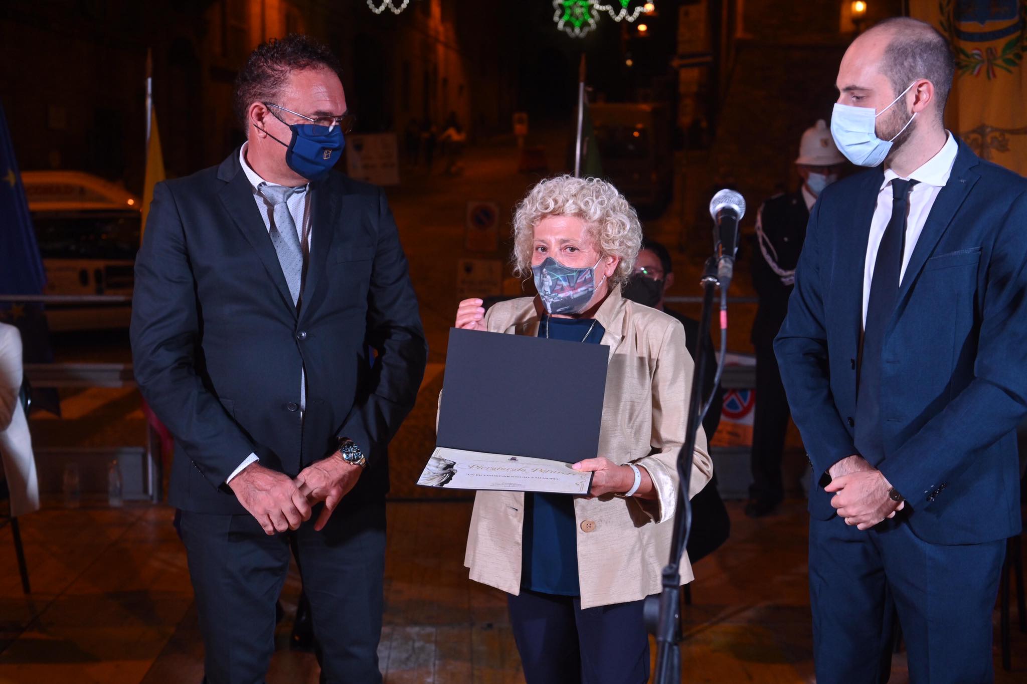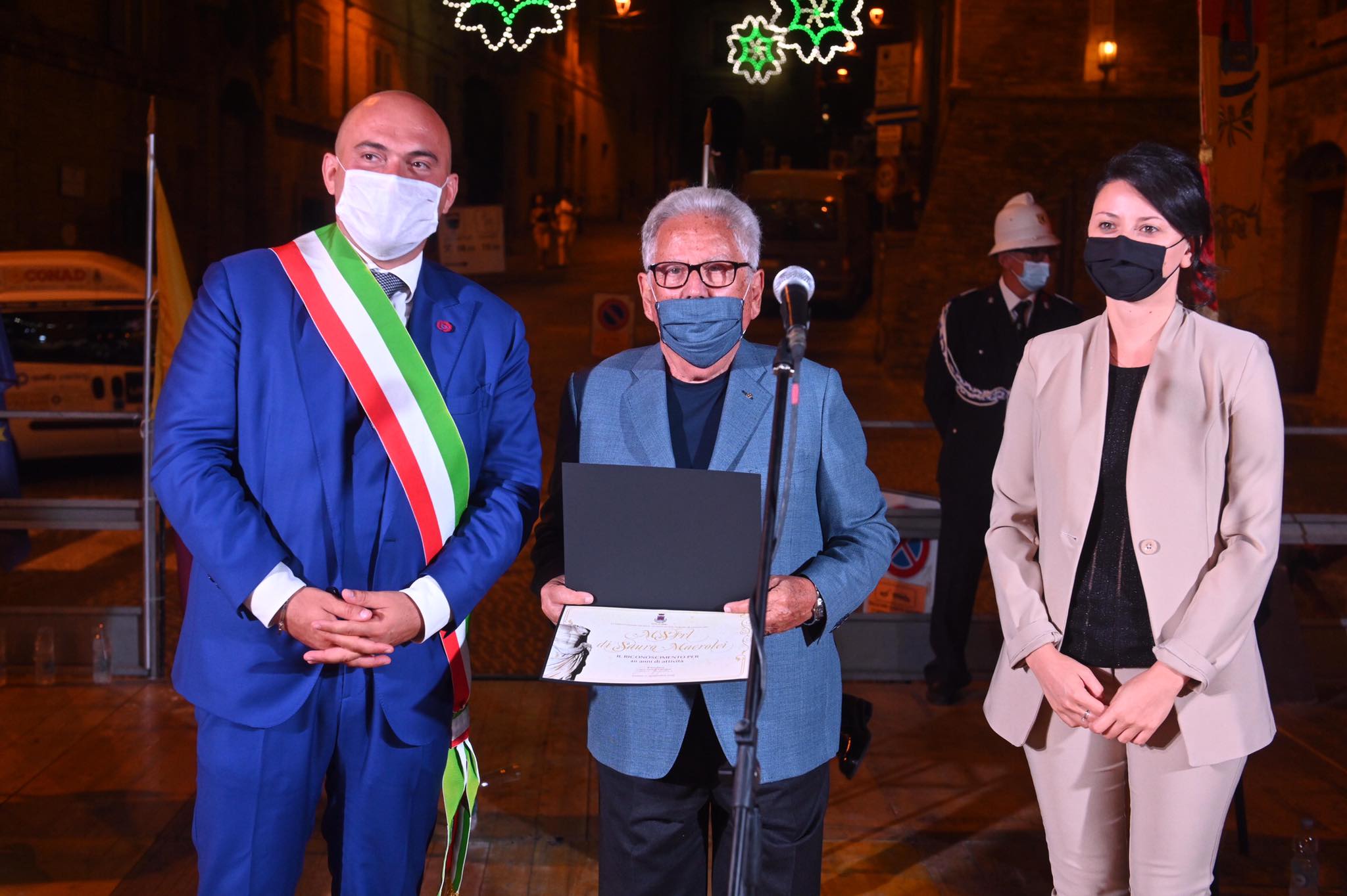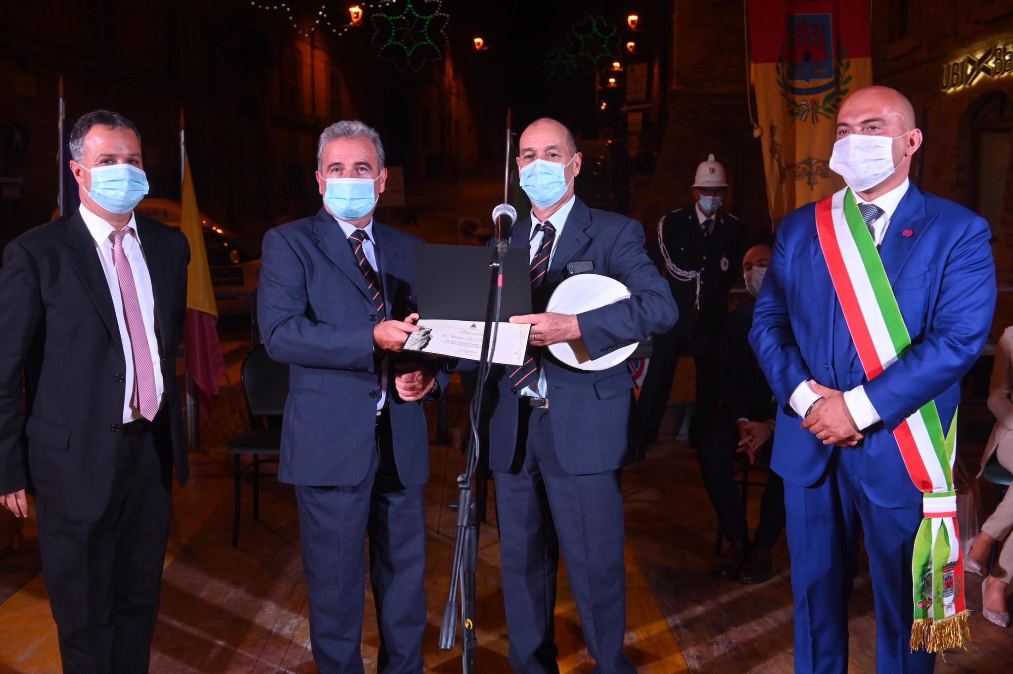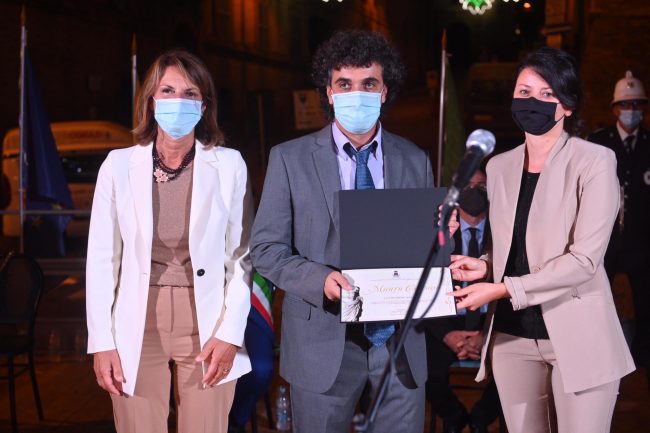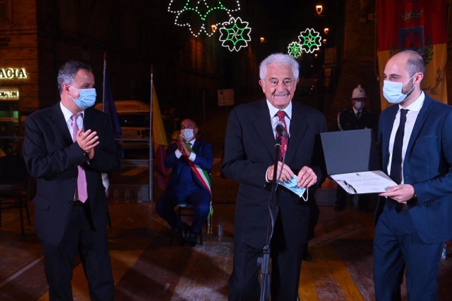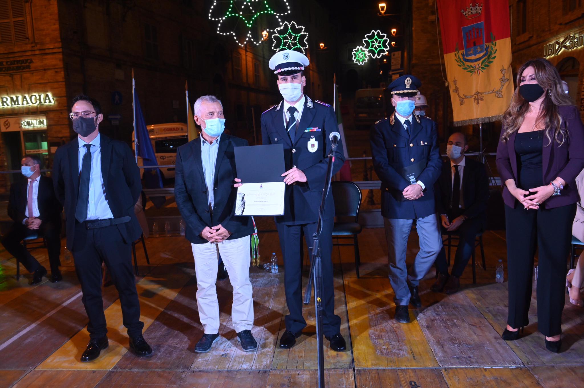Ieri sera, sul palco di piazza del Comune tra un pubblico in assetto anti Covid, il sindaco Simone Pugnaloni, gli assessori e il presidente del Consiglio hanno consegnato i riconoscimenti ai protagonisti che hanno omaggiato il nome di Osimo (al link l’elenco dei premiati). Tra applausi e ricordi, è scattata la commozione alla lettura della lettera scritta dai familiari di Andrea Rocchi, deceduto a marzo a Cingoli, ai quali è stata consegnata una pergamena alla memoria. Un messaggio d’affetto della compagna del 40enne, letto dall’assessore Michela Glorio.