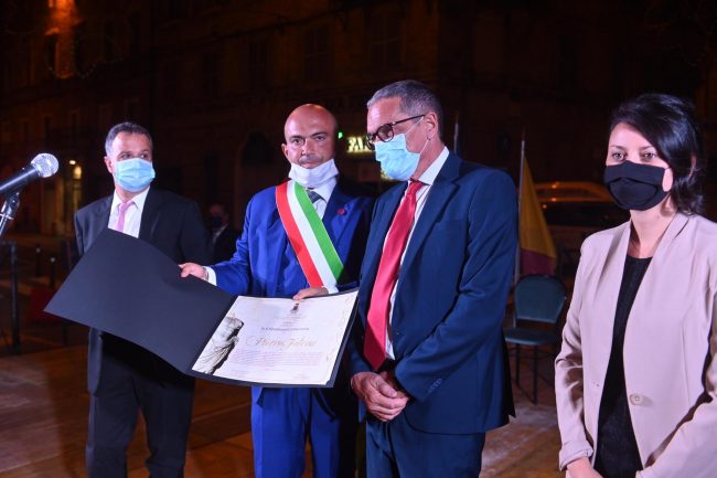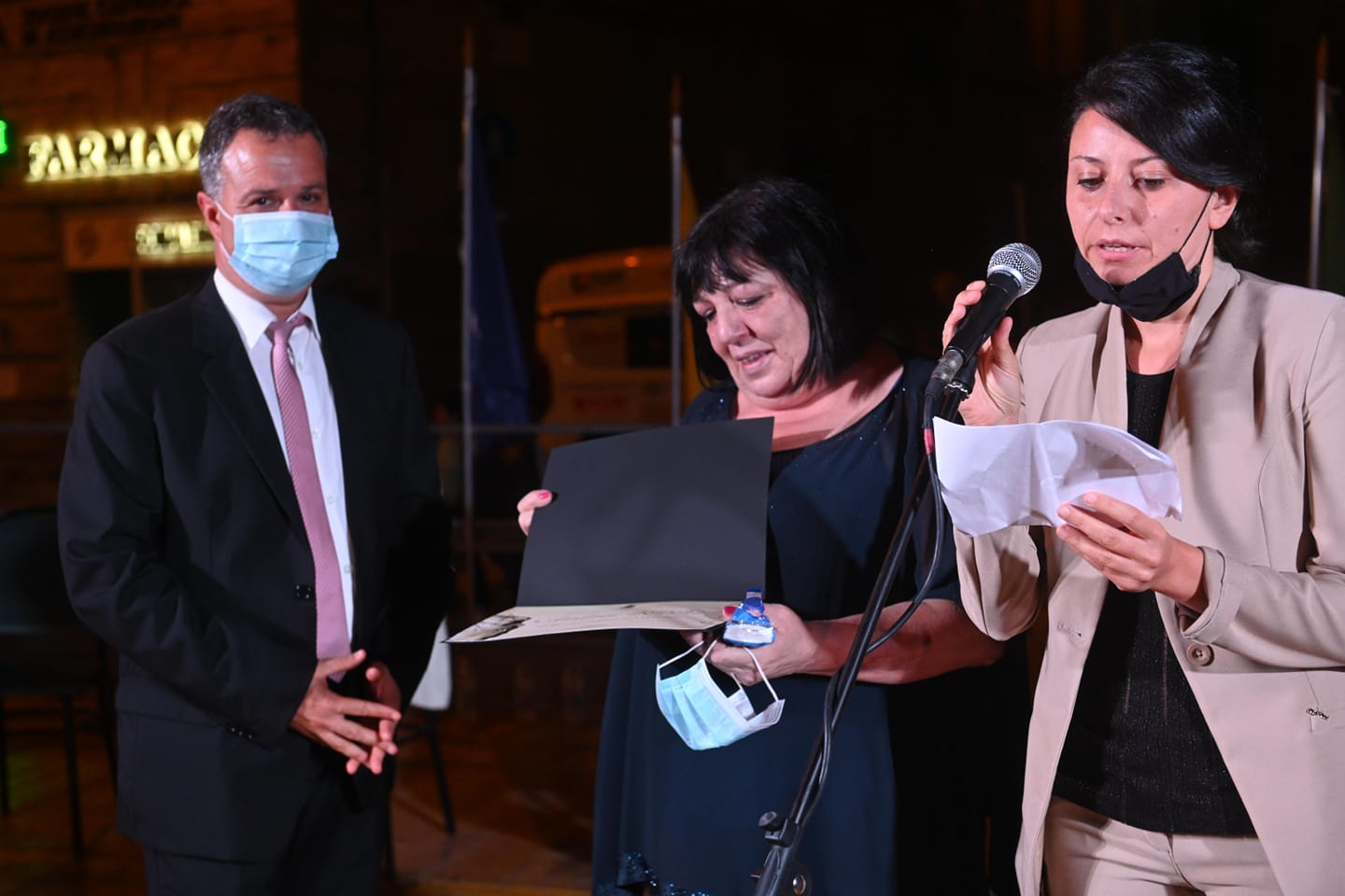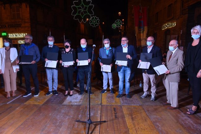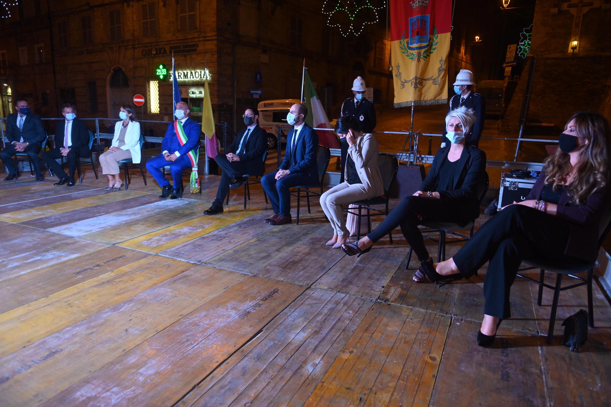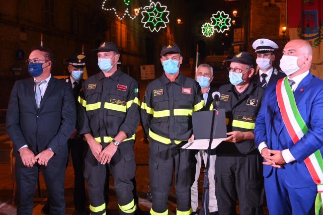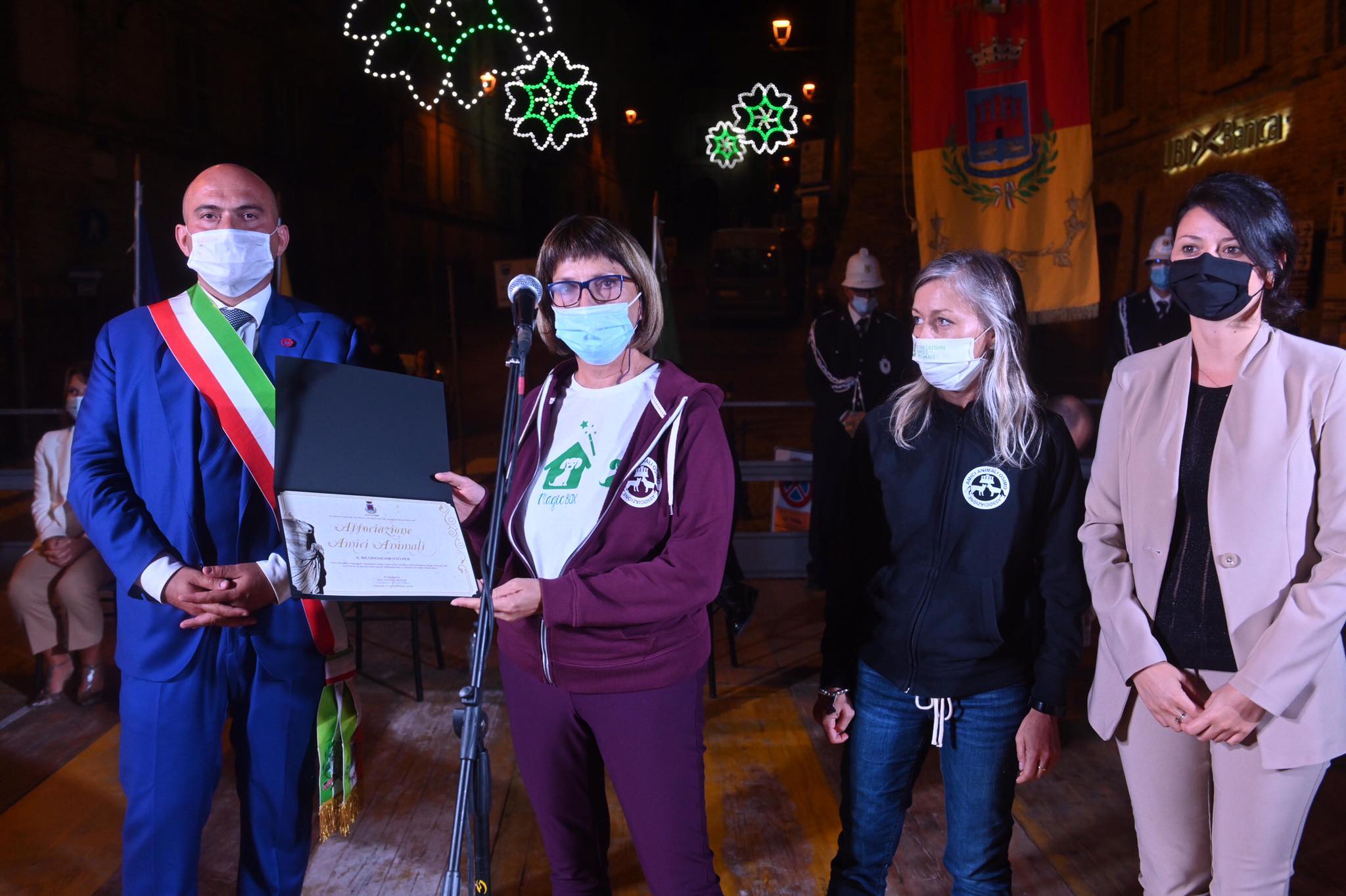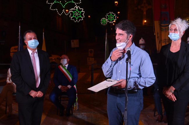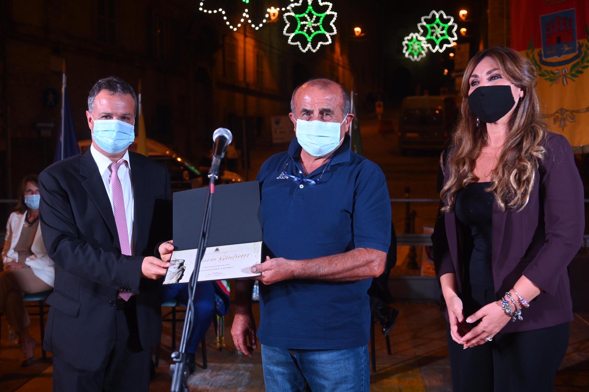 Ieri sera, sul palco di piazza del Comune tra un pubblico in assetto anti Covid, il sindaco Simone Pugnaloni, gli assessori e il presidente del Consiglio hanno consegnato i riconoscimenti ai protagonisti che hanno omaggiato il nome di Osimo (al link l’elenco dei premiati). Tra applausi e ricordi, è scattata la commozione alla lettura della lettera scritta dai familiari di Andrea Rocchi, deceduto a marzo a Cingoli, ai quali è stata consegnata una pergamena alla memoria. Un messaggio d’affetto della compagna del 40enne, letto dall’assessore Michela Glorio.