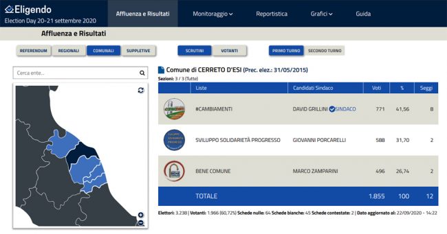 Ha vinto con un buon vantaggio sugli avversari, il sindaco uscente,  proprietario dell’ex Jp Industries  Giovanni Porcarelli (Sviluppo, solidarietà, progresso) attestato sul 31,70%, e Marco Zamparini (Cerreto D’Esi Bene Comune) che ha incassato il 26,74%. I tre protagonisti della politica cerretese sono tornati a scontrarsi ma stavolta gli scenari storici e politici erano diversi e gli equilibri si sono ribaltati portando alla vittoria Grillini sostenuto dall’area di centrosinistra. Il desiderio di voltare pagina degli elettori era stato preannunciato già ieri dall’aumento della percentuale di affluenza alle urne: i votanti per le Amministrative 2020 sono stati 60.7% dei 3.238 aventi diritto (pari a 1966), rispetto al 58.6% del 2015.  Due le schede contestate, 64 quelle nulle, e 45 quelle bianche Dei 10 seggi, la lista di Grillini porterà in Consiglio comunale 8 esponenti (sindaco compreso), quella di Porcarelli 2 come anche quella di Zamparini che entreranno di diritto entrambi nel parlamentino cittadino.