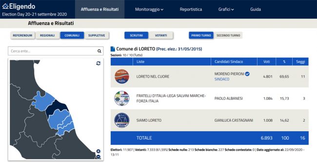 Non c’è stata storia da raccontare: Moreno Pieroni, 59 anni, in passato già due volte sindaco della città mariana e assessore regionale uscente, con la sua lista civica ‘Loreto nel cuore’ ha stravinto ed è andato oltre. Con il 69,65% dei consensi ha seminato i competitor Paolo Albanesi, 52 anni, responsabile tecnico di una ditta (Prima Loreto lista civica con tutti i simboli dei partiti di centrodestra) che si è fermato al 15,73,% e Gianluca Castagnani, 53 anni, funzionario regionale e consigliere comunale di minoranza uscente (lista Siamo Loreto in corsa anche per il Consiglio regionale con la civica Civitas) attestato sul 14,62%