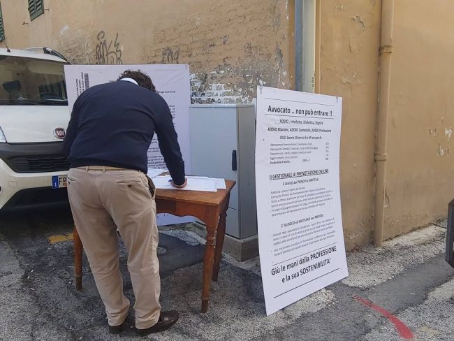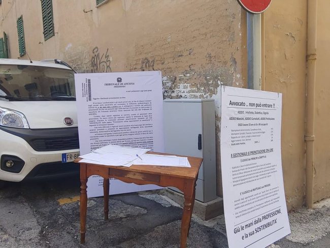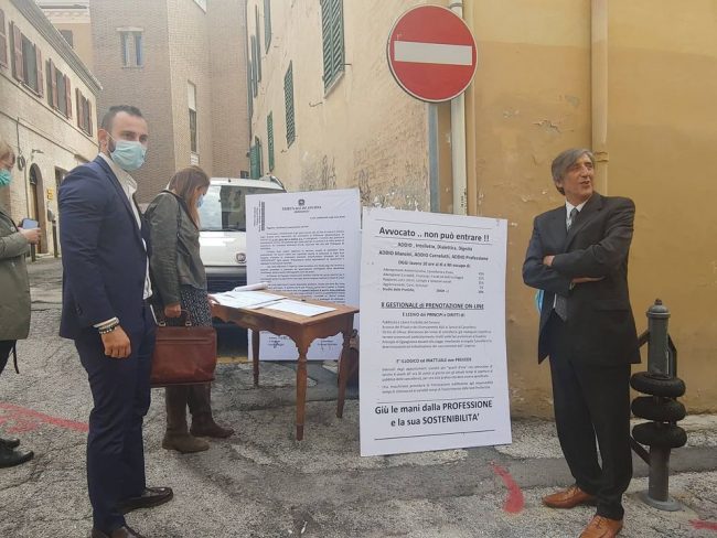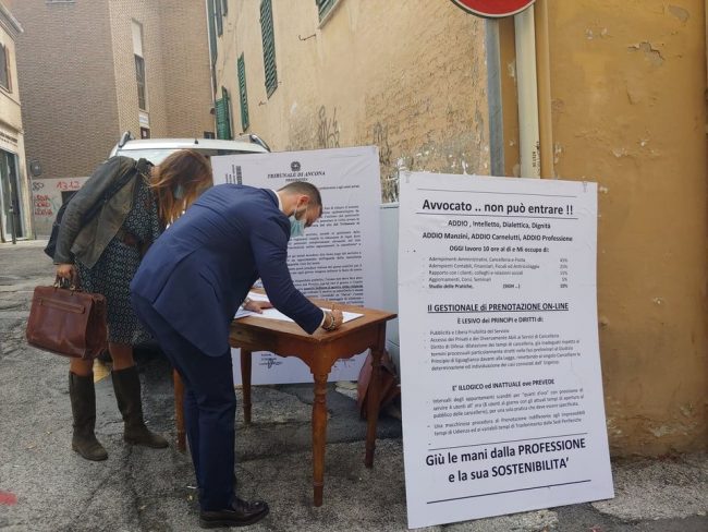 Prenotazione obbligatoria dei servizi di cancelleria: presidio di protesta davanti al tribunale di Ancona. Ad organizzarlo, questa mattina, è stato l’avvocato senigalliese Andrea Alessandrini, presentatosi di fronte all’ingresso del palazzo di giustizia con un banchetto e dei plichi per la raccolta firme, destinata a un’eventuale impugnazione del provvedimento redatto dal presidente del tribunale Giovanni Spinosa. Un provvedimento entrato in vigore da oggi che rende obbligatoria la prenotazione per andare in cancelleria e visionare i fascicoli. La decisione è stata presa «al fine di ridurre il numero degli accessi nelle cancellerie per contrastare la diffusione epidemiologica da COVID-19». In ogni sessione va specificato il motivo della richiesta d’appuntamento e, ovviamente, va scelto l’orario rimasto disponibile. «Ci sono scansioni di un quarto d’ora – ha detto Alessandrini -. La riduzione del servizio è inaccettabile e non tiene conto degli impegni degli avvocati», tra appuntamenti in studio, negli uffici della procura e udienze. «C’è l’emergenza Covid – puntualizza Alessandrini – ma le cancellerie non sono mai state congestionate. Per visionare più fascicoli servono prenotazioni molteplici». Nella raccolta firme, si chiedeva agli utenti del tribunale: “Impugneresti il decreto presidenziale?”. Almeno un centinaio di legali hanno barrato la casella del ‘sì’, commentando anche la scelta della prenotazione, entrata in vigore da oggi. Queste le parole utilizzate: «Insostenibile», «indecoroso per la nostra professione», «inaccettabile», «lesivo del diritto di difesa», «ci tolgono la dignità professionale».
