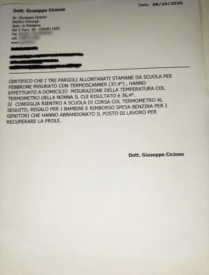 “Certifico che tre i pargoli allontanati stamane da scuola per febbrone misurato con il termoscanner (37,4°), hanno effettuato a domicilio misurazione della temperatura con il termometro della nonna il cui risultato è di 36,4°. Si consiglia rientro a scuola di corsa con termometro al seguito, regalo per i bambini e rimborso benzina per i genitori che hanno abbandonato il posto di lavoro per recuperare la prole”. E’ diventata virale la mail a firma del dott. Giuseppe Cicione, medico pediatra di Osimo, fotografata e postata da lui stesso stamattina sui social media. «In realtà non l’ho davvero inviata alle scuole dei tre ragazzini, dai 3 agli 11 anni, che sono stati davvero allontanati dalle rispettive classi come sospetti casi di Covid, ma è proprio quello il testo del certificato che avrei voluto scrivere» ci scherza su, tra il serio e il faceto, il medico osimano, segretario della Fimp, la Federazione italiana medici pediatri della provincia di Ancona, e vice segretario della sezione regionale Marche. Una boutade, la sua, per denunciare circostanze che stanno diventando problematiche: la continua richiesta di certificati medici (e quindi di tamponi) ai pediatri per gli alunni delle scuole dell’obbligo, dalle materne alle Medie.