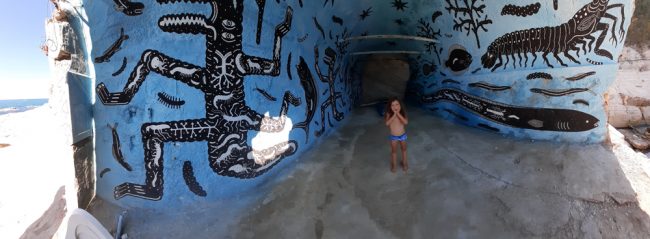 Ma della realtà magica e generosa di forti suggestioni che si è materializzata, seducendo occhi e anime dei visitatori, in una delle più note tra le circa 400 cavità scavate per la stragrande maggioranza nella marna della lunga falesia che si tuffa dal colle Cardeto nel litorale fino al rione di Pietralacroce. Ebbene, “Animali balneari”, il progetto artistico realizzato la scorsa estate dall’estroso, sperimentale pittore Andre The Spider, attivo da tanti anni ad Ancona, è un’opera monumentale dentro quello che a ben ragione può essere considerato una specie di monumento, il Passetto appunto. Figure antropomorfe e zoomorfe dall’irresistibile fascino affollano le pareti interne di un vasto antro roccioso parte di quella – che volendo essere precisi – è una delle due grotte della zona ad incavo della porzione di falesia solcata dallo stradello che scende dai giardinetti della parte alta di via Panoramica. Quella aperta, da una vita abbandonata, accanto all’altra adiacente chiusa. Una tappa in questo sito straordinario (profondità di 5 metri e mezzo, ampiezza e altezza massima 3 metri circa) è davvero d’obbligo.