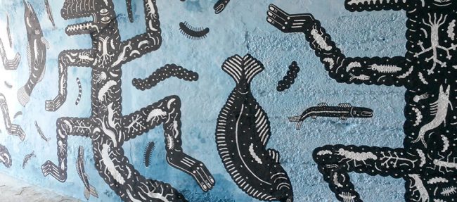 Non solo le pareti, ma anche la volta, brillano totalmente di un intenso color turchese, che si riflette, cangiante, nel blu dell’acqua sottostante. La fauna ittica dipinta in bianco e nero da Andre The Spider è un mix creativo dove si perdono i confini fra il realistico e il fantastico. Seppie giganti, cicale di mare (in vernacolo anconetano le succulente “nocchie”), murene ci riportano un po’ alla realtà, spiccando sulla parete di destra. Un realismo “sui generis”, perché nell’osservare, la mente si riempie di rimandi a specie magari estinte nella preistoria, o mutanti. La mente vola ad archetipi espressivi antichissimi, oppure futuristici, nell’ammirare altre creature marine piacevolmente inquietanti. E questo ossimoro ci sta tutto. Perché anche i quattro personaggi che sembrano voler uscire dal fondo più oscuro di questo ambiente semi-undergound, di umano hanno ben poco, quasi fantascientifici.