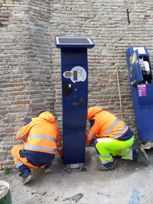 A Osimo è partita da via Fontemagna la sostituzione dei parchimetri usurati dal tempo. Nel primo tratto della strada che circumnaviga la cinta muraria della città da stamattina sono al lavoro gli operai di Osimo Servizi per cambiare i parchimetri obsoleti e installarne di nuovi.«Il primo lotto composto da 4 nuovi parchimetri sono già arrivati in azienda e verranno posizionati in questo periodo nel territorio a seconda delle esigenze tecniche e delle segnalazioni pervenute nell’ultimo anno. Il nuovo parchimetro è dotato di un piccolo pannello fotovoltaico che garantisce una maggiore durata alla batteria presente all’interno».