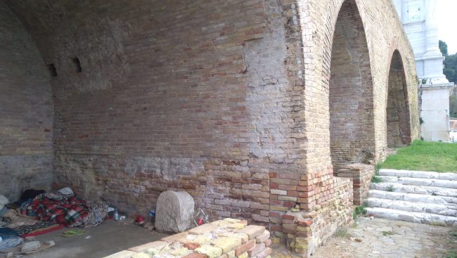 Materassi, coperte, scarpe, infradito, ciabatte, zaini, resti di cibo e chi più ne ha più ne metta. Tutto questo lo si può trovare ormai da alcune settimane nei pressi dell’arco di Traiano, al porto. La zona delle arcate che portano verso il Clementino sembra essere stata trasformata in una sorta di dormitorio che, a giudicare dal numero di giacigli che vi si trovano, di notte o con il primo calare del buio, ospita probabilmente numerose persone. Giacigli, inoltre, che proprio negli ultimi giorni sembrano essere aumentati di numero.