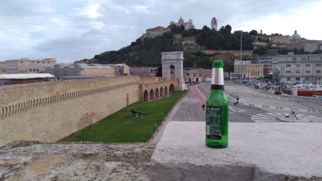 Difficile non notare però questa situazione di abbandono, soprattutto se si cammina lungo la “linea rossa”: quel percorso pedonale creato nel 2015 per far sì che gli anconetani, e i turisti d’estate, si riappropriassero della parte più importante dello scalo e potessero ammirarla nel suo splendore. La passeggiata si trasforma in uno sguardo, invece che sulla storia, sul degrado attuale. Le coperte sono ammassate una sull’altra a formare quasi delle piccole montagne e chissà che sotto non vi sia ancora qualcuno che vi sta dormendo in gruppo. Così, sparpagliate qua e là, sono anche i vari tipi di calzature. Non si fa poi fatica a scorgere borsoni grandi o piccoli che siano, ma comunque apparentemente pieni. Posate di plastica sono invece gettate a terra dopo essere state utilizzate. Che qualcuno sotto quegli archi ci dorma di notte, sembra dunque essere scontato altrimenti, tutte quelle coperte, sarebbero già state tolte da chi effettua in zona un servizio di sorveglianza e sicurezza. Se non altro, tolte per decoro. Persone certamente senza fissa dimora, che lì sotto hanno però trovato una sorta di domicilio. La “linea rossa” è poi percorsa con frequenza da chi al porto va per correre o semplicemente per fare una passeggiata e lo sguardo dei passanti cade proprio là così come cade su alcune bottiglie abbandonate lungo il camminamento che dall’Arco di Traiano porta al Clementino. Vetri di birra abbandonati sul muretto nonostante vi sia un grosso cestino per i rifiuti. A terra poi, anche pacchetti di sigarette vuoti e bottigliette di plastica. Oltre ad una situazione di degrado, regna purtroppo anche la maleducazione di molti.