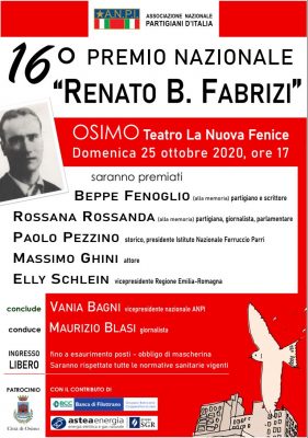 Tra i due fattori che hanno portato al successo il Premio Nazionale “Renato B. Fabrizi” ci sono stati sicuramente la qualità degli emeriti, sempre presenti a tutte le quindici edizioni, e il calore e la presenza del pubblico a sottolineare la straordinarietà degli interventi e l’empatia che i racconti delle partigiane e dei partigiani sanno suscitare. La consegna del Premio Nazionale “Fabrizi” avrà luogo domenica 25 ottobre alle ore 17. In questa sedicesima edizione, che ci apprestiamo a celebrare, sarà tutto diverso. «Visto il peggioramento della situazione sanitaria l’intera organizzazione dell’Anpi ha infatti deciso di svolgere la consegna del riconoscimento a porte chiuse, senza il pubblico, e con buona parte dei premiati collegati online. – fa sapere una nota ufficiale dell’Anpi Osimo – Gli emeriti di questa edizione hanno nomi altisonanti e conosciuti: saranno premiati alla memoria Beppe Fenoglio e Rossana Rossanda, a nome dei quali interverranno Margherita, la figlia dello scrittore e partigiano e Carlo Latini, già dirigente de Il Manifesto, e poi Paolo Pezzino, storico UniPI e presidente dell’Istituto Nazionale Ferruccio Parri , Elly Schlein, vice presidente della Regione Emilia Romagna e Massimo Ghini, di cui non occorre certo presentazione. Siamo sicuri che anche quest’anno gli emeriti sapranno coinvolgere il pubblico che potrà seguire la cerimonia in diretta Facebook sulla pagina Anpi Osimo e Anpi Comitato Provinciale Ancona e in differita televisiva su E’tv Marche (canale 12) sempre domenica ma alle 21». La conduzione della serata è affidata a Maurizio Blasi, già caporedattore del TgR Marche mentre le conclusioni affidate alla Vice Presidente Nazionale Vania Bagni.