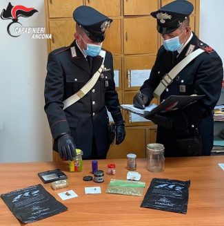 Nascondeva nell’armadio della sua camera da letto hashish e marijuana. Nel pomeriggio di ieri, i Carabinieri della Stazione di Offagna hanno arrestato un 21enne di Castelfidardo, trovato in possesso di sostanza stupefacente e strumenti per la confezione di dosi. Nel corso dei servizi finalizzati al contrasto del fenomeno dello spaccio e del consumo di sostanze stupefacenti nella Valmusone, i militari hanno perquisito l’abitazione del giovane e rinvenuto, occultati all’interno dell’armadio della sua camera da letto, 77 grammi di hashish in una confezione in cellophane, 10 grammi di marijuana contenuti in due contenitori in vetro per conserve, 44 semi di marijuana, un bilancino elettronico e strumenti per la confezione di dosi destinate allo spaccio. Il 21enne è stato, quindi, arrestato, mentre la droga ed il materiale rinvenuto sono stati sequestrati. L’operazione conferma l’incessante impegno dell’Arma del Comando Provinciale di Ancona nell’infrenare il fenomeno dello spaccio di sostanze stupefacenti che ha già permesso l’arresto di diversi spacciatori negli ultimi mesi, nonché il sequestro di diversi chilogrammi di sostanza stupefacente, come avvenuto tre giorni fa a Marcelli di Numana, quando i Carabinieri di Osimo avevano arrestato una persona perché trovato in possesso circa 70 grammi di cocaina ed hashish.