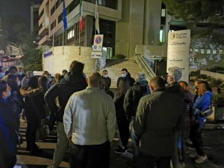 La protesta di ieri sera davanti a Palazzo Raffaello: i manifestanti parlano con il vice presidente Mirco Carloni