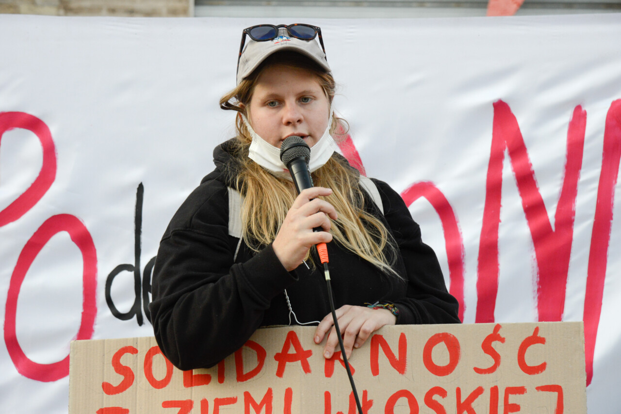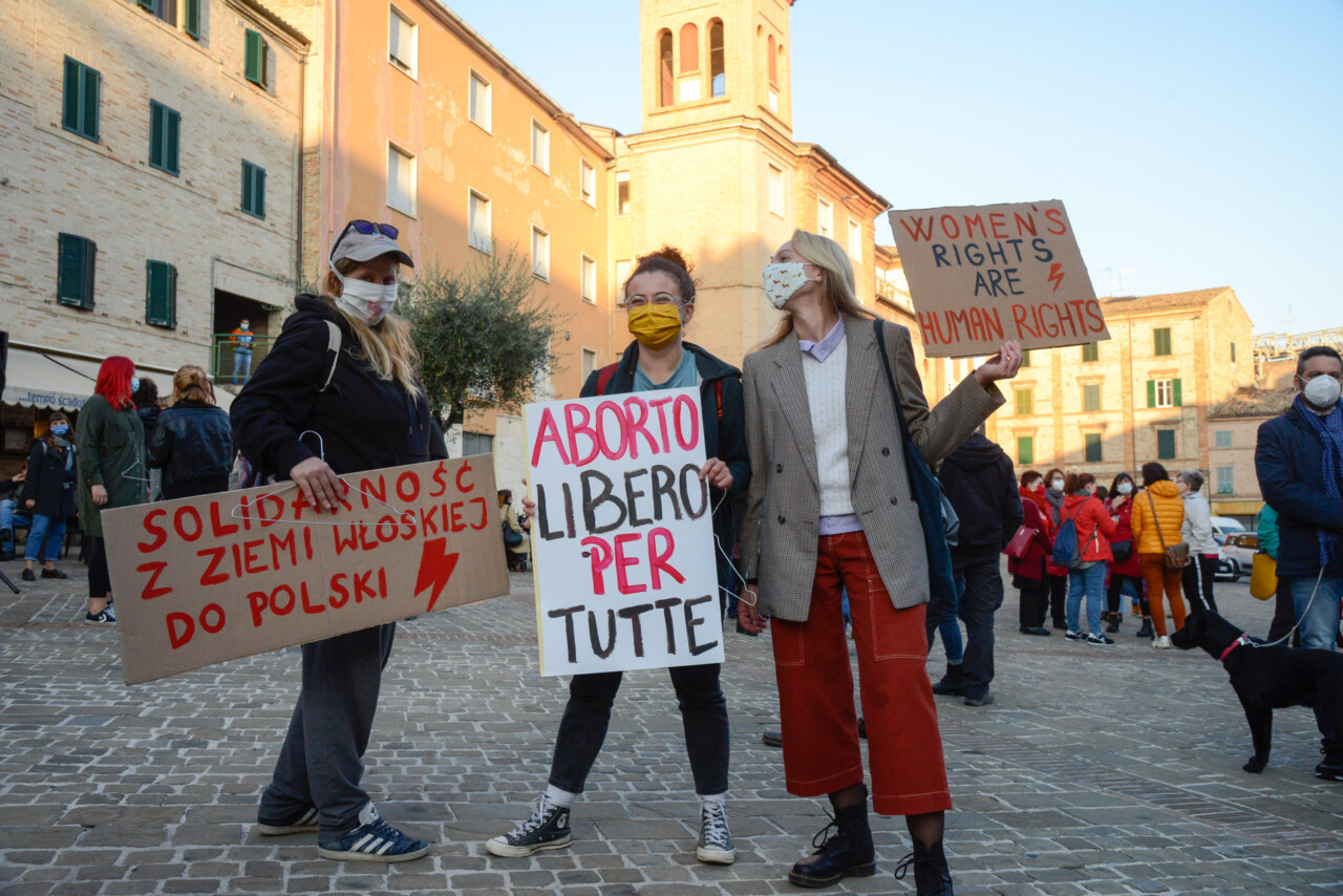 Testimone simbolico, più delle stesse parole, i simboli quali le grucce, gli ombrelli e il fulmine rosso. «Vi chiederete perché vi abbiamo chiesto di portare una stampella. Questo strumento rappresenta un esplicito richiamo agli aborti illegali, domestici, clandestini, ultima istanza in un momento in cui era impossibile ricorrere alle procedure mediche, legali e sicure, per interrompere una gravidanza. Oltre ad essere un monito, la stampella, insieme all’ombrello e il fulmine rosso, è uno dei simboli scelti dalle donne polacche nelle loro manifestazioni di piazza, verso le quali esprimiamo solidarietà e sostegno. Essere qui oggi, è un atto politico». Così Cecilia Ercoli, di Non Una Di Meno Macerata, apre la piazza. Il suo è solo uno dei tanti moniti alla reazione e vicinanza alle donne polacche. Una, tra queste, Zuzia Luczak, presente proprio a Macerata, ha mostrato solidarietà anche alle compagne polacche, incitando: “Tojestwojna!” (“Questa è guerra!”).