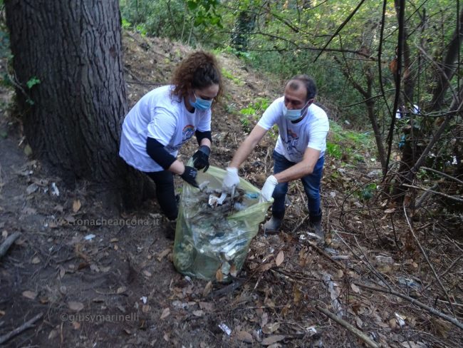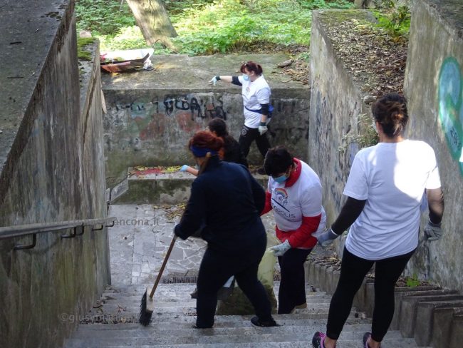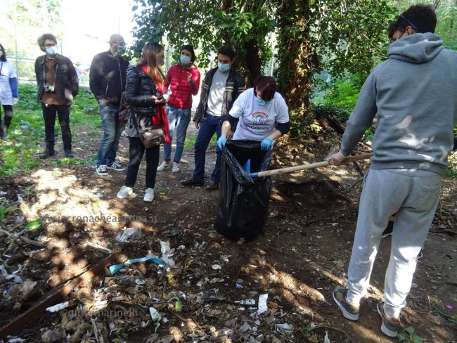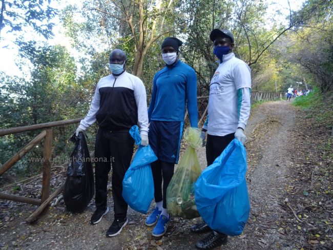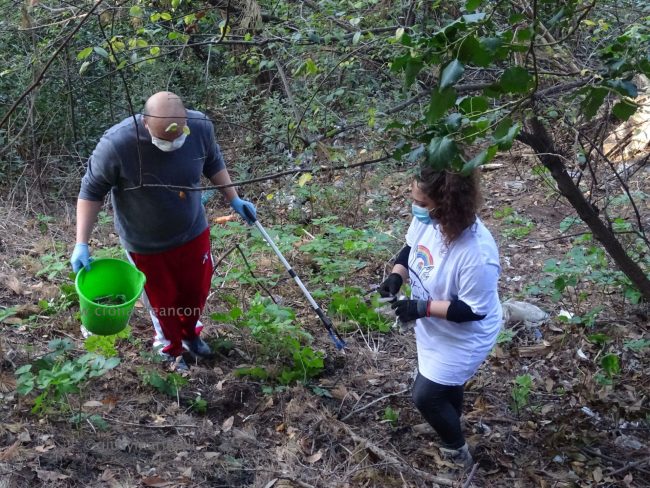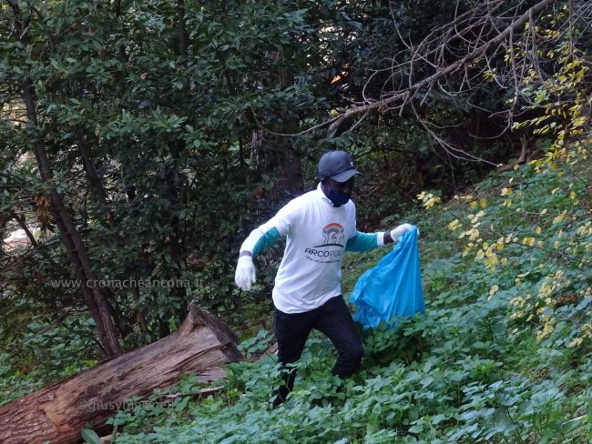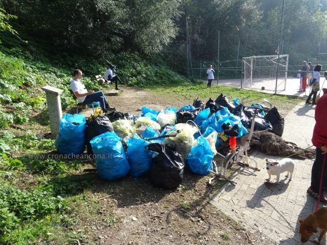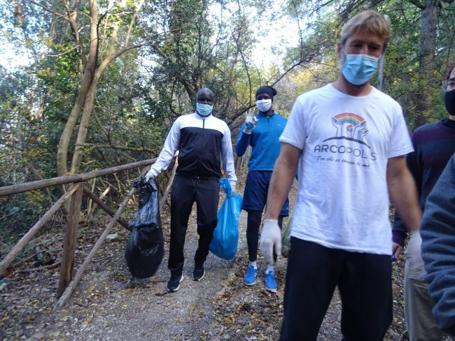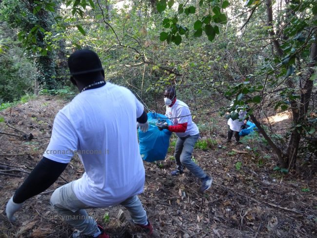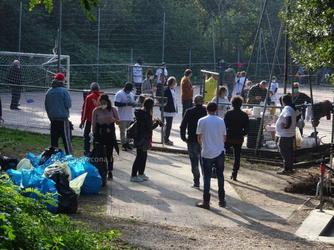 Quattro ore di lavoro duro, dalle 9,30 alle 13,30, perché la situazione di degrado nella zona era da terzo mondo. Con un fuori programma finale. I membri di “Arcopolis”, affiancati dai residenti di questo microcosmo multietnico della città – bambini, ragazzi, giovani, anziani, donne e uomini di mezza età, tanti fratelli migranti – hanno operato in modo certosino, armati di un pollice verde davvero esemplare, indossando le mascherine, dotati di guanti, bidoni e recipienti per la raccolta (messi a disposizione dal circolo “Il Pungitopo” di Legambiente Ancona) di una valanga di immondizie di ogni tipo sedimentatesi nei vari ettari del parco bosco – più simile ad una giungla, malamente illuminato, purtroppo spesso frequentato anche di notte da balordi, senzatetto e tossicodipendenti – che da via Fornaci Comunali sale su fino in via Pergolesi, inglobando il campetto di calcetto. In una atmosfera di festa e allegria, con tanto di punto di ristoro (dolci, caffè, bevande, predisposto in un angolo della struttura sportiva al’aperto) e un registratore a diffondere musica.