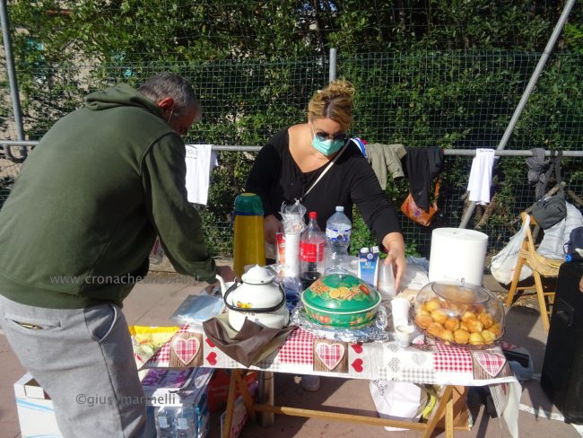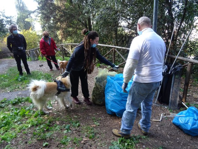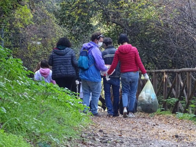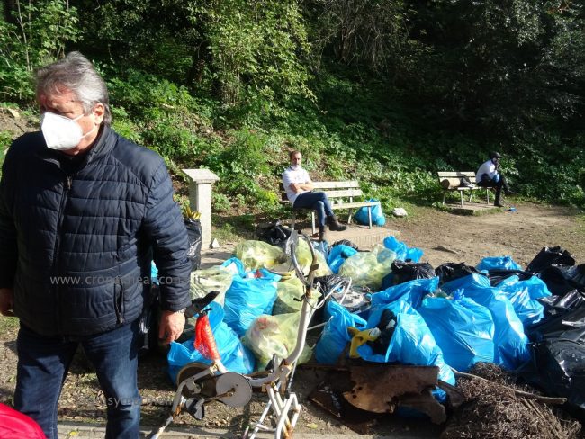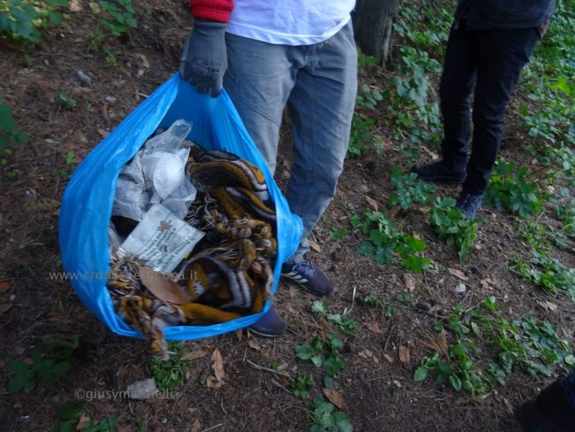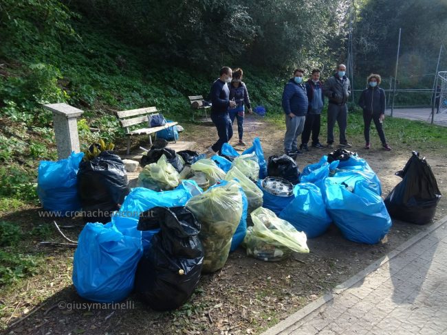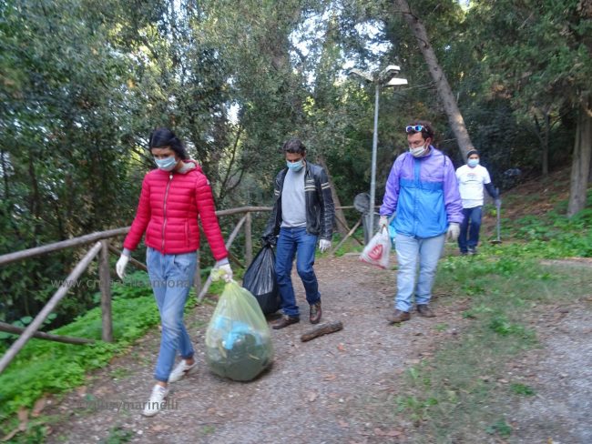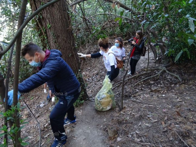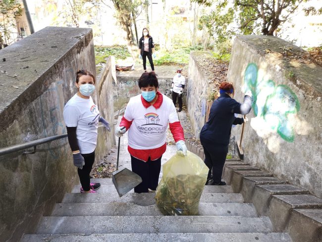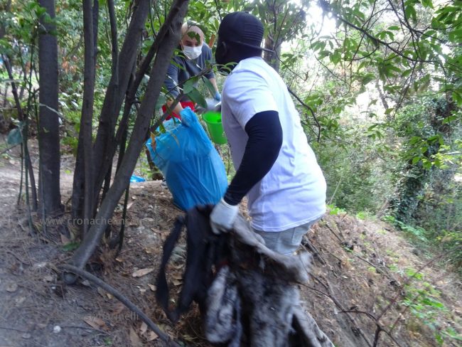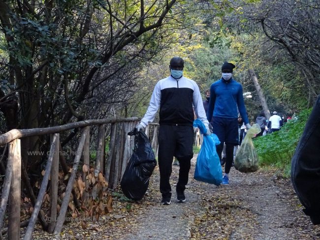 Quattro ore di lavoro duro, dalle 9,30 alle 13,30, perché la situazione di degrado nella zona era da terzo mondo. Con un fuori programma finale. I membri di “Arcopolis”, affiancati dai residenti di questo microcosmo multietnico della città – bambini, ragazzi, giovani, anziani, donne e uomini di mezza età, tanti fratelli migranti – hanno operato in modo certosino, armati di un pollice verde davvero esemplare, indossando le mascherine, dotati di guanti, bidoni e recipienti per la raccolta (messi a disposizione dal circolo “Il Pungitopo” di Legambiente Ancona) di una valanga di immondizie di ogni tipo sedimentatesi nei vari ettari del parco bosco – più simile ad una giungla, malamente illuminato, purtroppo spesso frequentato anche di notte da balordi, senzatetto e tossicodipendenti – che da via Fornaci Comunali sale su fino in via Pergolesi, inglobando il campetto di calcetto. In una atmosfera di festa e allegria, con tanto di punto di ristoro (dolci, caffè, bevande, predisposto in un angolo della struttura sportiva al’aperto) e un registratore a diffondere musica.