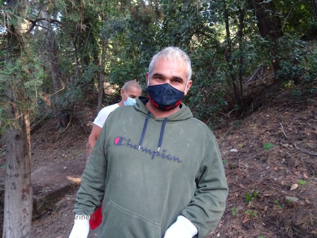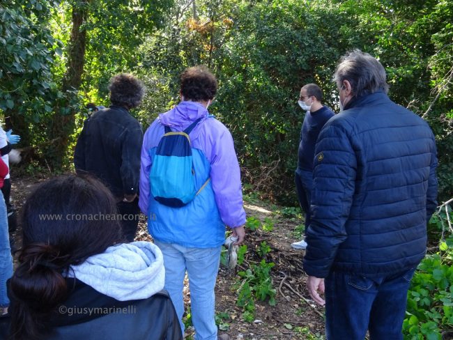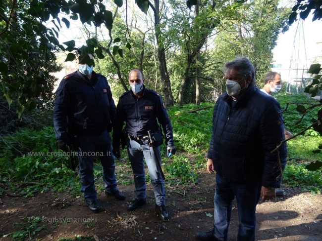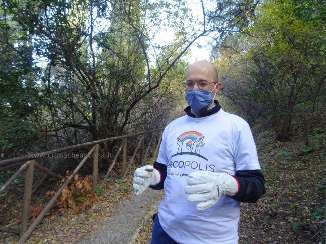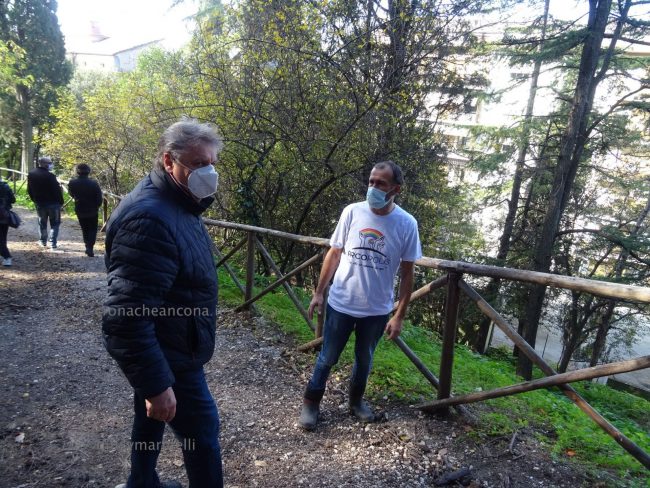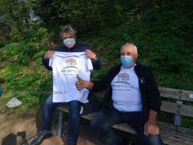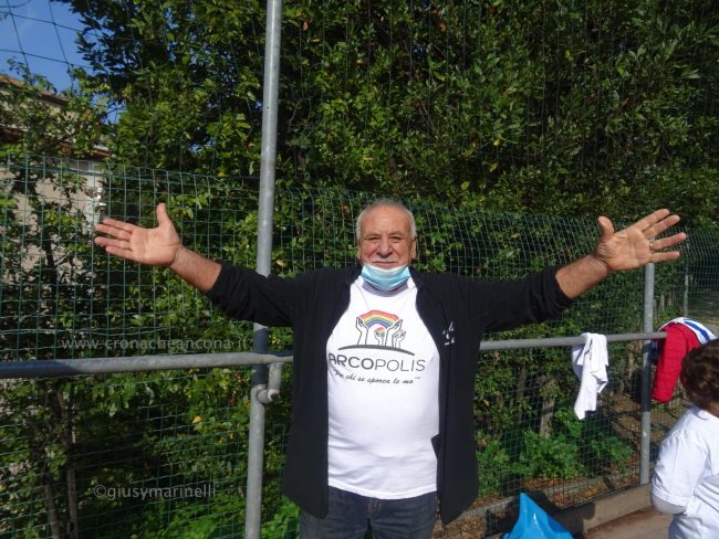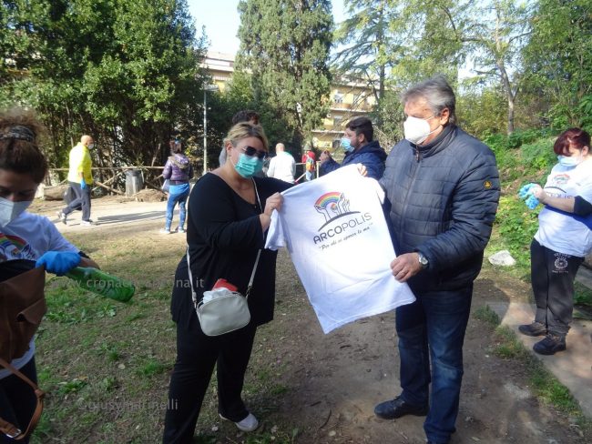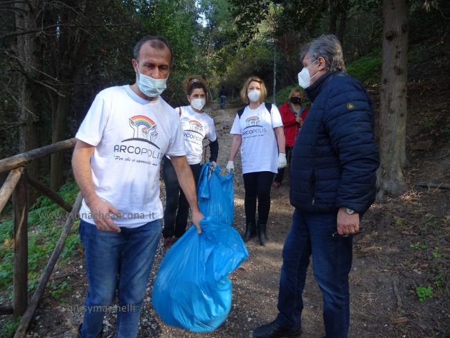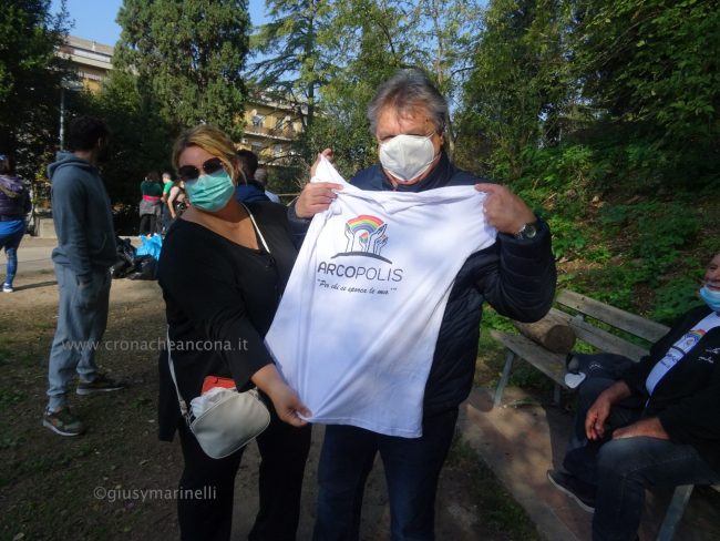 Merito in gran parte dell’opera di sensibilizzazione sociale, civica, culturale di “Arcopolis”, nata tre anni fa, che raccoglie in sé anche le forze di altre associazioni degli Archi, e che organizza vari eventi. Come le due edizioni del torneo di calcetto “Educalci” in collaborazione con la coop Polo 9 (2018 e 2019), al quale hanno partecipato una decina di squadre multietniche di bambini e ragazzini, e “El riò nel palò” (altro torneo di calcetto) svoltosi nella primavera dello scorso anno, dove hanno giocato i più grandi. «Per la verità tre settimane fa, su nostro sollecito, nel bosco sono arrivati gli operatori di AnconAmbiente, hanno portato via perfino materassi. – ha spiegato Silvio Boldrini, presidente di Arcopolis – Ma è chiaro che non basta, era dal 2018, mi pare, che non si facevano vedere qui”. “Questo parco, virtualmente bellissimo, si trova cronicamente in stato di abbandono, ostaggio di spacciatori e di gente che si disfa illecitamente di rifiuti. – ha continuato Boldrini – Il Comune ha ottenuto che la polizia venisse più di frequente a controllare. Ma questa situazione di degrado non si risolverà con interventi di polizia, l’Amministrazione comunale provveduto raramente ad una opera di manutenzione vera, con ritardo e sempre perché sollecitata da noi. Chiediamo che si sporchi le mani in mondo puntuale e periodico e che installi un impianto di illuminazione efficace». Già, “che si sporchi le mani”. Come fa Arcopolis. Sulle magliette dei suoi soci, oltre a mani che reggono un arcobaleno, campeggia proprio la scritta “Sporcamoce le ma’”, che era anche il titolo dell’ìniziativa di stamattina.