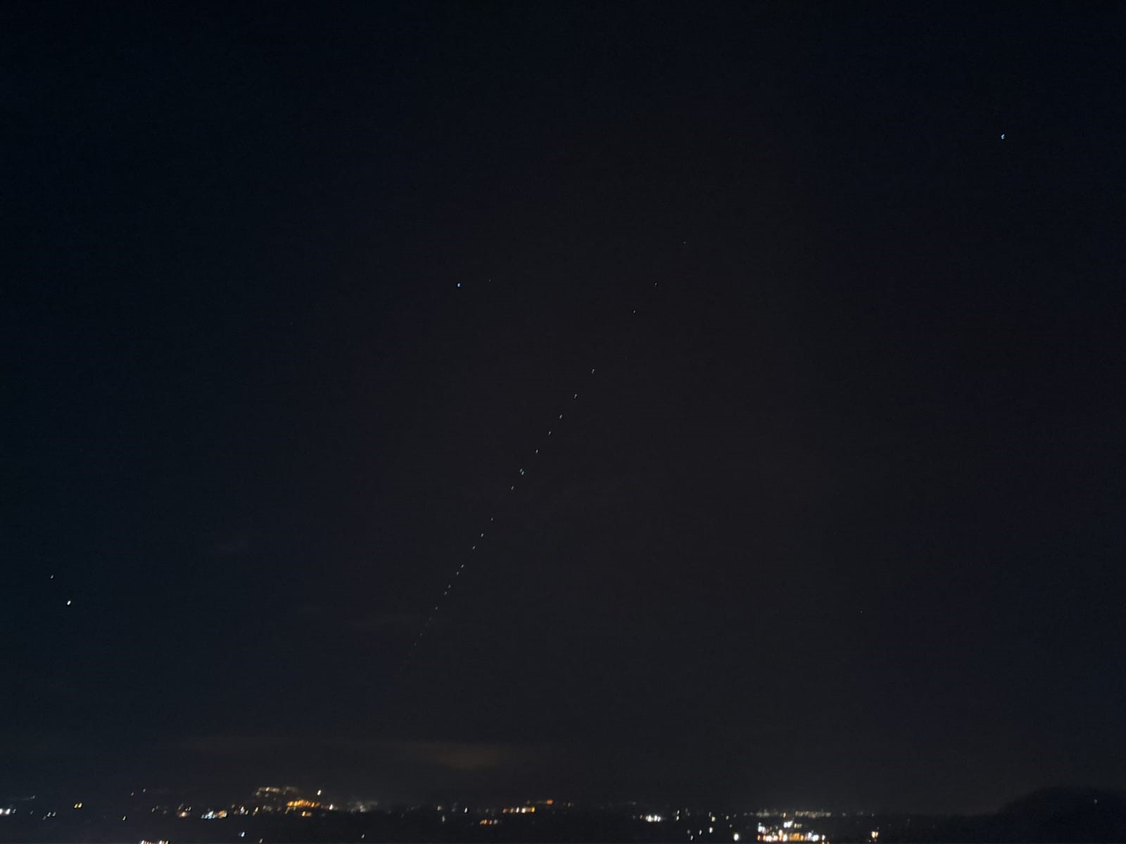 La ‘costellazione’ dei satelliti mandati in orbita da Elon Musk fotografata stasera da Piazza Nuova dall’osimano Francesco Toccaceli