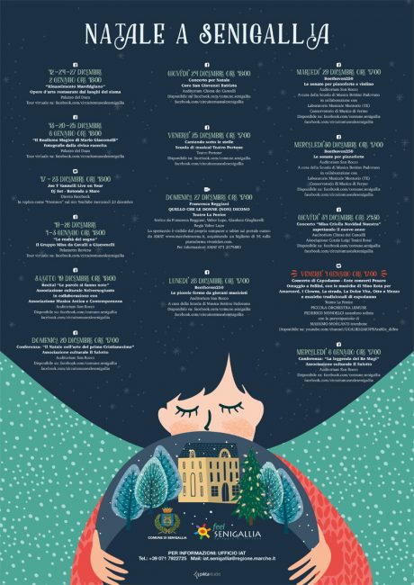 Il ‘Natale a Senigallia’, è questo il titolo della rassegna culturale organizzata dall’Amministrazione comunale in occasione delle festività natalizie. Una serie di appuntamenti musicali, teatrali, di animazione culturale fruibili dalla cittadinanza attraverso la rete ed i canali social del Comune in conformità alle misure normative per contrastare la diffusione del Covid 19 che vietano gli eventi in presenza. Un calendario che vede al centro le associazioni e le realtà culturali del territorio protagonisti di una serie di eventi di grande qualità ed originalità. «In questo tempo sospeso a causa dell’emergenza Covid – spiega in una nota il sindaco Massimo Olivetti – il Natale continua a rivestire un ruolo fondamentale nelle nostre vite in quanto periodo riservato alle relazioni familiari e agli affetti più autentici. Per questo motivo l’Amministrazione comunale ha deciso di celebrare le festività natalizie attraverso un fitto calendario di manifestazioni fruibili attraverso la rete e i canali social del Comune, nel pieno rispetto degli standard di sicurezza ed evitando qualsiasi assembramento. Concerti, eventi espositivi, spettacoli teatrali che vedranno come sempre protagoniste le nostre associazioni e le realtà culturali e sociali locali. Un modo per sentirsi più vicini nonostante il distanziamento fisico, l’occasione per affrontare e superare insieme un momento difficile e diventare una comunità sempre più coesa».«Nonostante le difficoltà legate alle misure normative per il contenimento della diffusione del virus Covid 19 – ha aggiunto l’assessore alla cultura Riccardo Pizzi – come Amministrazione comunale abbiamo voluto in ogni modo elaborare un calendario di iniziative culturali per le festività natalizie sia pure in modalità on-line. Saranno le nostre preziose realtà culturali del territorio a custodire e diffondere con il linguaggio universale dell’arte lo spirito del Natale».