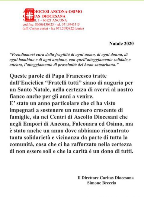 Anche ad Osimo e nella Valmusone la crisi economica si è fatta sentire sulla pelle di chi ha perso il lavoro o si è trovato nell’impossbilità di lavorare e un ruolo fondamentale in questo contesto sociale è stato svolto proprio dalla Caritas attraverso il Centro d’Ascolto e l’Emporio della Solidarietà. «Il primo, garantendo costantemente assistenza psicologica/vicinanza/sostegno/ orientamento, mentre l’Emporio ha fornito una fonte sicura di approvvigionamento alimentare e non solo. – ricorda la Crocianelli – In questi mesi di emergenza epidemiologica il Centro d’Ascolto – punto nevralgico del sistema dei servizi di aiuto offerto dalla Caritas- è rimasto sempre aperto e operativo. «Le difficoltà di carattere economico legate alla perdita di lavoro, all’incertezza e alla paura di non poter trovare opportunità di reddito in futuro hanno spinto molte persone a cercare un supporto umano nell’ascolto approfondito, per poter riacquistare un po’ di speranza e fiducia nel futuro. -prosegue Donatella Crocianelli – Vi si sono rivolte 303 persone, di cui 194 donne e 108 uomini. Sono stati effettuati 3962 interventi sia telefonicamente che in presenza, di cui 1000 ascolti. Per molti di questi (75 casi) si è trattato di una prima volta. Gli interventi di aiuto hanno riguardato in egual misura sia italiani che persone di origine straniera, impiegate normalmente in lavori stagionali, precari, con scarse tutele. Tra le richieste più frequenti l’accesso all’Emporio e l’erogazione di contributi economici (per un totale di 15.000 euro tra pagamento di bollette, affitti e sostegno ai minori)». L’Emporio ha registrato 593 domande di accesso (491 nel 2019), 231 tra persone e nuclei familiari, di cui 10 di Offagna, 3 di Filottrano, 1 di Castelfidardo e 1 di Numana. 1799 carrelli per cui abbiamo una presenza di 12 persone ogni apertura. Sono stati spesi 529.564 punti per una valorizzazione di 72487 euro. Prodotti distribuiti: 3408 kg. di pasta, 3539 barattoli di pomodoro, 4182 litri di latte, 1236 litri di olio extravergine di oliva e 1191 litri di olio di semi, 384 alimenti per l’infanzia e 442 pacchi di pannolini.