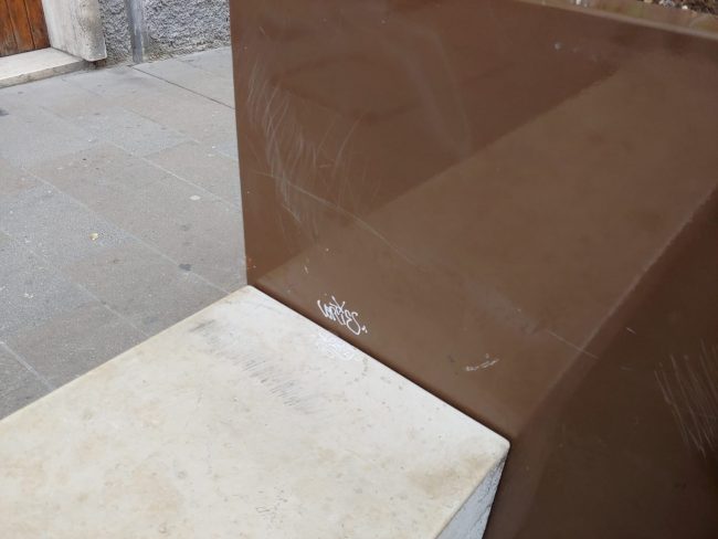 ANCONA - Scarabocchi, scritte e imbrattamenti tra piazza Cavour e corso Garibaldi, dove i vandali hanno lasciato un segno anche sulle installazioni in acciaio collocate di fronte ai negozi