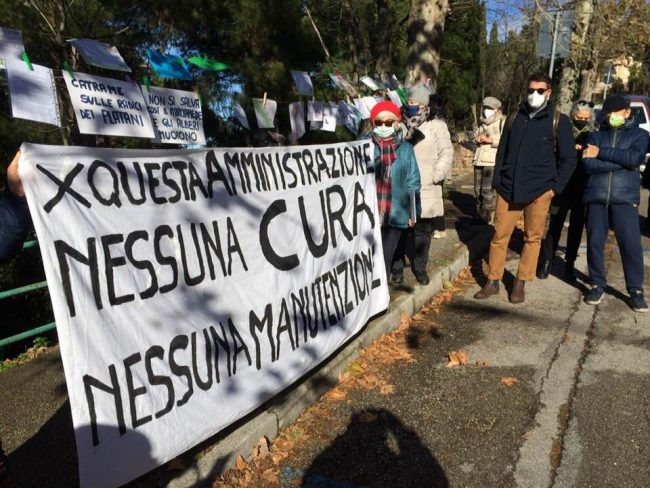 Sulla pratica dell’abbattimento in genere, come ultima soluzione possibile, e la mancanza di una virtuosa programmazione in tema di verde pubblico, è tornato il biologo Claudio Zabaglia, ex funzionario della Regione Marche: «Ancona è una delle poche città che non ha approntato un censimento di tutte le specie e degli esemplari presenti. Si parte quindi col piede sbagliato. Né risulta che il Comune tenga conto del manuale guida redatto dal Ministero nel 2017 proprio ad uso delle municipalità. Una guida che sollecita, oltre al censimento, una pianificazione, progettazione, cura, manutenzione e nuove piantumazioni adatte e certi spazi urbani, che indica come le potature non vadano compiute in modo pesante e solo ogni tanto, ma in modo mirato e secondo un cronoprogramma. Un guida che auspica scientifiche valutazioni di stabilità degli alberi prima di abbatterli. Inoltre il Comune non si avvale della possibilità messa in campo dall’Assam che fornisce gratuitamente semi e alberelli per nuove piantumazioni». «Il Comune di Ancona – ha aggiunto Francesco Rubini – a differenza di altri Comuni marchigiani, è privo di un regolamento del verde, malgrado quanto disposto dall’art. 20, comma 6 della legge regionale 23/02/2005 che detti norme su tutela, progettazione, realizzazione e gestione e cura del verde urbano. Oltre a questo regolamento – ha aggiunto Rubini – chiediamo nuove piantumazioni coinvolgendo finalmente i CTP e i cittadini, le cui segnalazioni di criticità nel settore non vengono ascoltate in Comune. Contraddittorio e anacronistico pensare ad un’Ancona città capitale della cultura nel 2022 – ha concluso Rubini – senza che la Giunta prenda atto che il verde è cultura, la sua cura un elemento si sensibilità civile. Occorre quindi una svolta ecologica nella politica di settore. Il verde limita lo smog e migliora la qualità dell’aria, e invece questa Amministrazione continua ad insistere per la progettazione di parcheggi (quello San Martino, ndr) in pieno centro attrattivi d traffico veicolare, progetta nel porto storico una banchina per meganavi da crociera iper inquinanti, investe poco nel trasporto pubblico, non allarga le zone a traffico limitato e non ne realizza di nuove».
