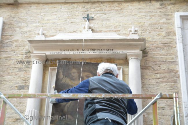 ANCONA - Si è dovuto attendere almeno un quarto di secolo e due inchieste della magistratura per ricollocare nella sua sede originaria il dipinto. Questo pomeriggio l'operazione per sistemare l'opera per mano del restauratore Francesco Maffei
