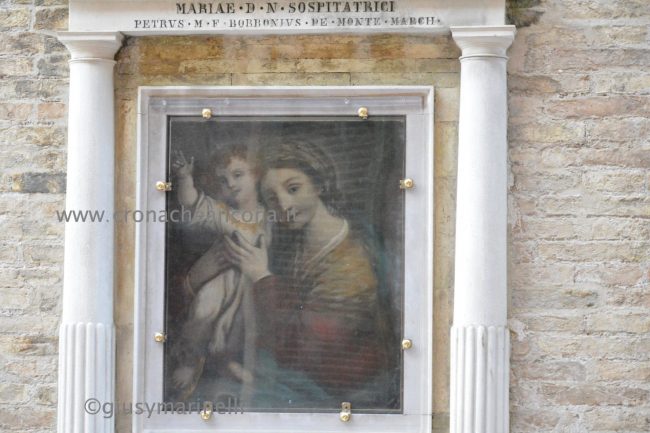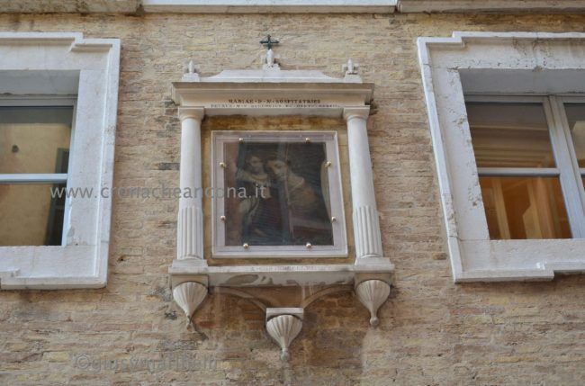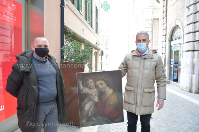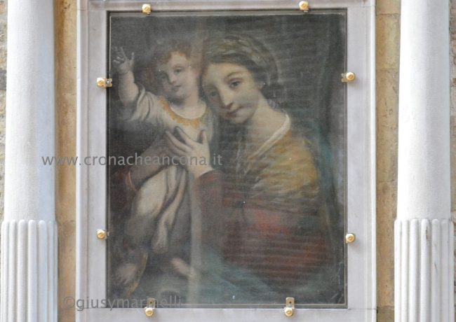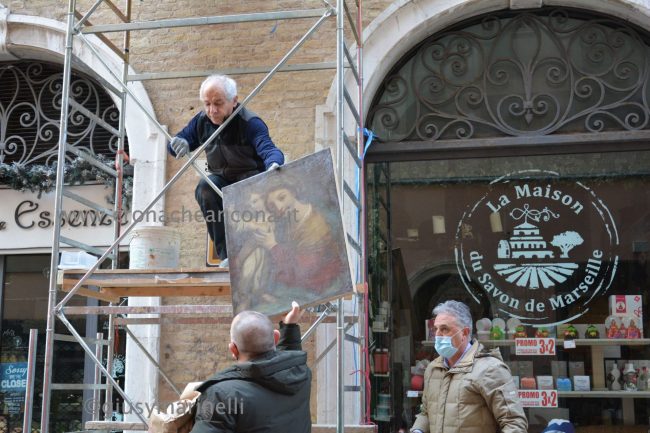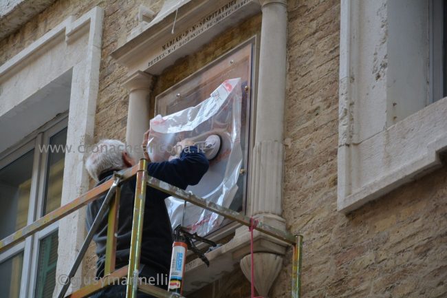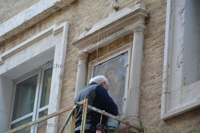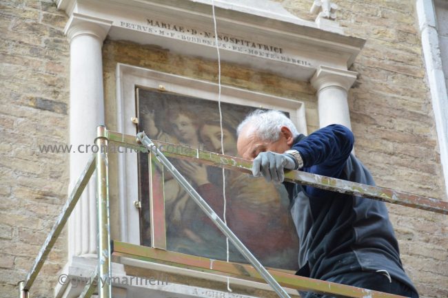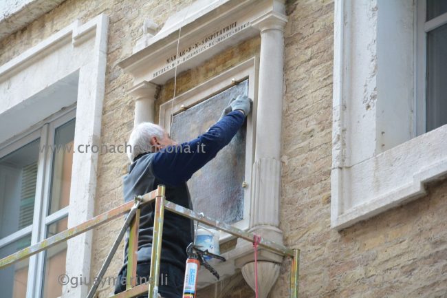 In quanto, venuto in possesso del dipinto ad olio probabilmente già negli anni ’90, ne aveva fatto la “perla” di un piccolo angolo architettonico votivo nel locale del suo ufficio. Protagonista del pomeriggio di oggi, invece, il restauratore di mobili e portoni Francesco Maffei, molto attivo ad Ancona. Intorno alle 17, dopo aver lavorato all’edicola anche domenica e giovedì scorsi, ha completato la complessa operazione del quadro. Quadro che nell’agosto del 2016 era stato portato via dai carabinieri del Nucleo tutela patrimonio beni culturali (Ntpc) in base a un decreto di sequestro del pm Paolo Gubinelli. Un’operazione complessa, va ribadito. Maffei ha usato prima una piattaforma mobile, poi un trabattello, ha compiuto sofisticate misurazioni e soprattutto scelto il pannello in plexiglas speciale (solo 8 mm di spessore), più trasparente del vetro e robustissimo che copre per proteggerla dalle intemperie la Madonna col Bambino. Già, ma come diavolo sparì il quadro? Occorre retrocedere nel tempo al 2014, quando il mensile free press Urlo aveva pubblicato un’inchiesta, poi ripresa da Cronache Ancona, nella quale aveva chiarito molti aspetti di quello che poteva considerarsi un giallo, e scoperto che di fatto il quadro era stato “privatizzato” dal professionista.  Quando? Moltissimi anni fa, prima che la società del professionista acquistasse Palazzo Jona e ne provvedesse alla completa e articolata ristrutturazione (che si sarebbe conclusa nel 2003) per poi, via via vendere o affittarne gli appartamenti ai nuovi coinquilini. Una ristrutturazione che era stata già intrapresa, ma poi interrotta, intorno alla metà anni ’80 da un precedente privato proprietario. Sarebbe stato questi quindi, forse nel 1988, a prelevare il quadro dall’edicola della facciata, per poi cederlo col palazzo. Ma da quell’edicola, appositamente progettata, non si sarebbe dovuto muovere, perché lì aveva voluto che ornasse il palazzo il committente dell’opera (probabilmente un ex voto), il marchese Pietro Bourbon del Monte nel 1856, e due secoli fa proprietario del palazzo poi Jona. E soprattutto, tornando al terzo millennio, non si sarebbe dovuta muovere perché il monumentale edificio è da un bel pezzo tutto vincolato – opere, affreschi interni e arredi compresi – dalla Soprintendenza. Da qui le due, successive, inchieste della procura. Con la seconda che ha accertato la violazione dell’art.169 del nuovo Codice dei Beni Culturali e del Paesaggio approvato con decreto legislativo n° 42 il 22 gennaio 2004. Il reato ipotizzato? La rimozione di un bene culturale senza l’autorizzazione della Soprintendenza (da alcuni anni unica) delle Marche.  Già, la soluzione, perché così tardiva? Anche considerando il costo, pari a meno di 1000 euro? Già prima del 2014, almeno dal 2012, l’agenzia immobiliare “Cimarelli”, che amministra il condominio “Jona”, rivolgendosi alle autorità competenti aveva ingaggiato un braccio di ferro con il professionista proprio per ottenere uno spostamento e una risistemazione dell’opera in modo che potesse essere goduta (come moltissimi altri beni di alto pregio nell’edificio) dagli altri residenti e dai cittadini ogni martedì mattina tra le 9,30 e le 12,30. Il professionista si sarebbe rifiutato di fatto di attuare le disposizioni ricevute più volte per la cessione del dipinto dalle Soprintendenze, sia quella di Urbino sia quella per le Belle Arti e Paesaggio delle Marche. Da qui la soluzione drastica del sequestro giudiziario del 2016. E altre lungaggini. Nonostante il costante impegno dello storico dell’arte Pierluigi Moriconi, della Soprintendenza delle Marche, presente oggi alla ricollocazione assieme al comandante dei Ntpc carabinieri Carmelo Grasso. Lungaggini dovute non tanto alla solita burocrazia ma soprattutto alla lentezza con cui l’Amministrazione condominiale “Cimarelli” procedeva nel concretizzare il ritorno della Madonna col Bambino nell’edicola. Nell’agosto scorso, quindi, la decisione del pm Gubinelli: nulla osta esclusivo alla Soprintendenza di Ancona a gestire e chiudere il caso. E così è stato, sebbene si son dovuti attendere altri 5 mesi. La “Cimarelli” ha ingaggiato l’esperto Maffei il quale ha fatto le cose a regola d’arte. Facilitato dal fatto  che il quadro era stato consegnato ai carabinieri in perfetto stato di conservazione, in quanto proprio la società di cui il professionista che occupa il palazzo fa parte se ne era sempre presa cura. Ai tempi in cui era esposto all’esterno si era molto deteriorato,  e la  società  ne aveva affidato un perfetto restauro allo specialista Bruno Vittorini di Urbino.