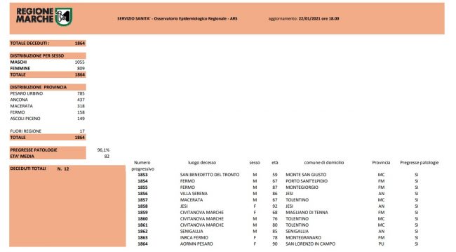 Tre morti in provincia di Ancona, positivi al Covid, secondo l’ultimo bollettino del Servizio sanità. Si tratta di un 86enne di Jesi, una 92enne di Jesi e un 85enne di Senigallia. Tra le altre vittime figurano quattro pazienti del Maceratese e sono inoltre scomparsi un 67enne di Porto Sant’Elpidio, un 87enne di Montegiorgio,una 68enne di Magliano di Tenna, un 85enne di Senigallia, una 78enne di Montegranaro, una 90enne di San Lorenzo in campo. Tutte le vittime presentavano patologie pregresse.