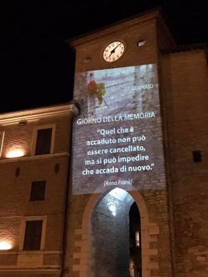 Una frase di Anna Frank proiettata sulla torre civica. «Con questa simbolica iniziativa, l’Amministrazione comunale di Cerreto d’Esi, guidata dal sindaco David Grillini ha voluto ricordare ed onorare le vittime della Shoah, in occasione della Giornata Internazionale della Memoria.- scrive in un post CambiaMenti, la lista civica di maggioranza – Una tragedia immane, che ancora colpisce ognuno di noi, nel nostro animo e coscienze. Il bianco e nero della figura scelta per la proiezione, evoca tristi immagini di dolore senza fine, di odio, di barbaro orrore, di fanatismo e razzismo; ma la rosa rossa sul filo spinato, simbolo di pietà e di commozione per l’umana sofferenza, ne attualizza il ricordo e ci fa ancora sperare, in una solida coscienza civile affinché si possa gridare ‘Mai più’».