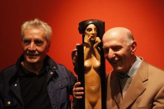 Giuliano Vangi e Aldo Grassini tra l’opera in ebano “Lucia”