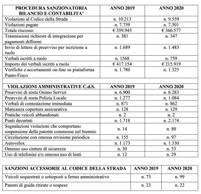 «La pandemia ha stravolto tutte nostre abitudini, repentinamente, e con esse il nostro modo di relazionarci agli altri. – ricorda l’assessora Federica Gatto – La necessità di contenere la diffusione del contagio e il lockdown hanno cambiato profondamente l’attività quotidiana della Polizia Locale alla quale è spettato un ruolo di primo piano nel far rispettare le disposizioni anti-Covid, oltre che nel rispondere alle migliaia di richiese di informazioni dei cittadini, cercando di fornire indicazioni, risposte e interpretazioni di dispositivi e ordinanze spesso pubblicate solo qualche ora prima. Nonostante ciò, l’attività della Polizia locale ha registrato risultati molto importanti sul fronte della sicurezza stradale e sulla prevenzione e repressione dei reati. Molti numeri che corrispondono ad una grande mole di lavoro, ore trascorse in servizio anche durante giorni festivi, affrontando difficoltà che la crisi pandemica ha sicuramente esacerbato. Al comandante Buscarini e a tutte le donne e agli uomini del Comando di Osimo va il ringraziamento dell’Amministrazione comunale a nome di tutta la Comunità osimana».