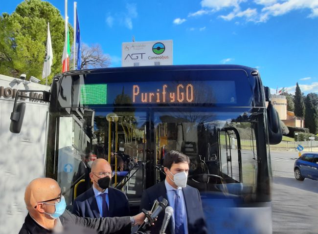 il settore dei trasporti sia «uno degli elementi più inquinanti in una città, ma è anche vero che oggi le soluzioni tecnologiche consentono di intervenire con maggiore rapidità per contrastarlo. Ancona in questo momento ha un programma di 20 milioni di investimenti per il rinnovo di un parco mezzi in un’ottica sostenibile, di cui 13 da fondi nazionali che, attraverso la Regione, consentiranno, di rinnovare il parco mezzi sempre in un’ottica sostenibile, soprattutto quelle elettrica». L’assessore ai Trasporti di Jesi Cinzia Napolitano ha inoltre evidenziato come «l’autobus sperimentale circolante affiancherà gli altri interventi di contenimento delle polveri sottili già attuate dall’amministrazione comunale». Il presidente Conerobus Muzio Papaveri ha rimarcato il forte connubio tra le politiche aziendali di trasporto e la sostenibilità sempre perseguita. Filippo Ugolini (presidente della Agt Engineerin e docente all’Università La Sapienza di Roma) ha descritto il funzionamento dei sistemi: «ogni veicolo è equipaggiato con due apparecchiature gemelle, che contengono filtri sia per PM10 che per PM2.5. I filtri di una muta sono uguali per tutti i bus, quelli della gemella variano per materiale da bus a bus. I veicoli percorreranno ciascuno un’area sempre uguale per tipologia (urbana, extraurbana, industriale). Al termine della sperimentazione il confronto fra i filtri uguali darà indicazioni sul livello di inquinamento delle aree percorse, quello fra i filtri diversi consentirà di scegliere i materiali più efficaci per la successiva fase industriale. Non ci fermeremo qui: per il futuro svilupperemo un sistema laser di bordo per il monitoraggio delle particelle, con l’obiettivo di rendere immediati, per la Regione e per Conerobus, i dati di inquinamento rilevati sul campo e nelle varie aree, oltreché rimuovere dall’ambiente le particelle intercettate».