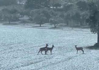 La neve veste la campagna tra Castelfidardo e Osimo e anche i cerbiatti si divertono a giocare sotto i fiocchi bianchi vicino alle abitazioni.