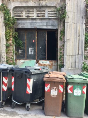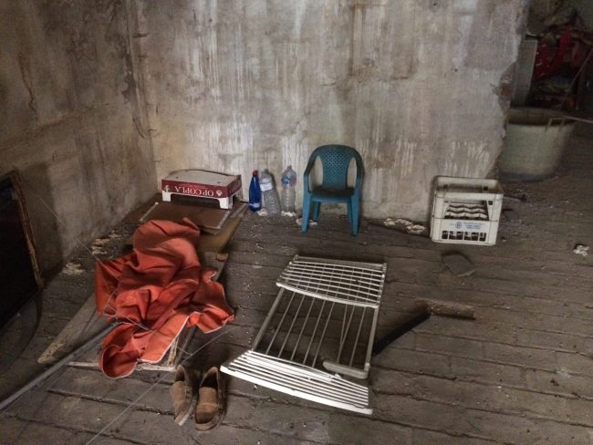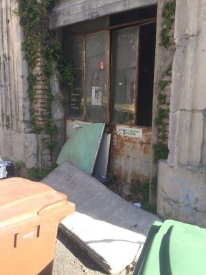 E, col probabile contributo di altri cittadini e per il lassismo delle istituzioni competenti ridotto in discarica. E’ sul lato destro della parte che inizia a salire di via Vallemiano; sul marciapiede opposto, interrotto da una stradina che porta a una palestra e all’Accademia Poliarte – affaccia una parrucchieria. L’ingresso è parzialmente coperto dai bidoni di uno dei punti della raccolta differenziata di Anconambiente. Una vecchia porta a due ante, parti basse in ferro tutte arrugginite, quelle superiori costituite da due grandi vetrate di cui una dimezzata. Facilissimo quindi entrare. Il varco è ampio. E dentro, oltre all’imperante luridume, evidenti segnali di frequentazioni da parte di persone che, purtroppo per loro, non hanno un posto dove passare la notte, oppure di gente che vuole starsene tranquilla a sbevazzare alcolici e a farsi le canne. Il locale è diviso in due vani in successione, ampiezza totale circa 200 metri quadri. Qualcuno ha tirato fuori dalla porta un materasso, forse per fargli prendere un po’ d’aria. Nel primo ambiente si notano in fondo sulla sinistra un angolo con ampi cartonati sul pavimento, una brandina in plastica pieghevole, un telone, una sediolina, fazzoletti di carta, un paio di scarpe e alcune bottiglie d’acqua. Qualcuno ci ha dormito.