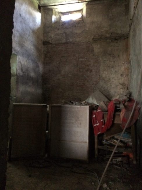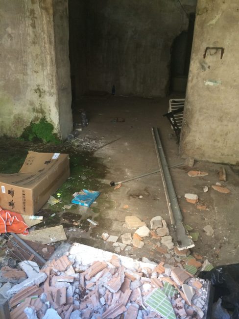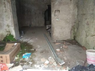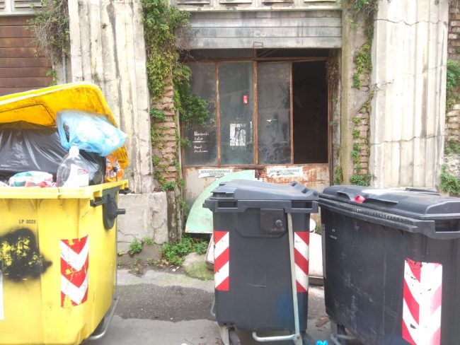 Le pareti sono tutte annerite dallo sporco e dalla muffa. Rifiuti ovunque e di ogni tipo: travi di ferro, stanghe di legno, sacchi di plastica, vecchi elettrodomestici, materiale edile di risulta, tante bottiglie di vetro e plastica (solo per fare alcuni esempi). Proseguendo nel secondo antro, più oscuro, la variegata immondizia, sedimentatasi nel tempo, raggiunge un’altezza di un metro e mezzo, in questo caso si tratta in gran parte di mattoni, di altri più grossi elettrodomestici fuori uso e di parecchio materiale da costruzione. Considerare che si tratta di un posto insalubre è davvero un eufemismo. “Pensione a 5 stalle”, un’ironia amara. Forse anche le bestie si rifiuterebbero di passare qualche ora in questo tugurio. Ironicamente amara anche la sbiadita scritta vicino all’entrata: “Ufficio affissioni comunali”. E già, perché, va ribadito, di proprietà municipale ancora si tratta. Il locale è una specie di piano terra, inserito nella muratura di contenimento che corre lungo il marciapiede, sopra il quale si erge l’ex casa del custode dell’ex Mattatoio Comunale di Valle Miano, poi per qualche anno riadattata a scuola, e da una vita chiusa, degradata e cadente.