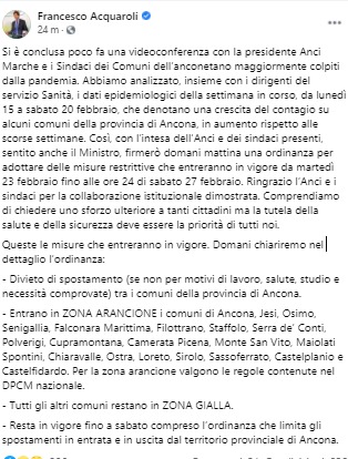 Aggiornamento delle 21.46 – Il governatore delle Marche Francesco Acquaroli ha comunicato che da martedì diventeranno arancioni i Comuni di Ancona, Jesi, Osimo, Senigallia, Falconara Marittima, Filottrano, Staffolo, Serra de’ Conti, Polverigi, Cupramontana, Camerata Picena, Monte San Vito, Maiolati Spontini, Chiaravalle, Ostra, Loreto, Sirolo, Sassoferrato, Castelplanio e Castelfidardo. Per la zona arancione valgono le regole contenute nel Dpcm nazionale. Tra queste, la chiusura di bar e ristoranti anche a pranzo e il divieto di spostamenti tra comuni se non motivi di necessità. Domani è attesa la firma dell’ordinanza. Si ricorda che il sindaco jesino Massimo Bacci aveva già deciso ieri pomeriggio che la città sarebbe diventata zona arancione a partire da domani.