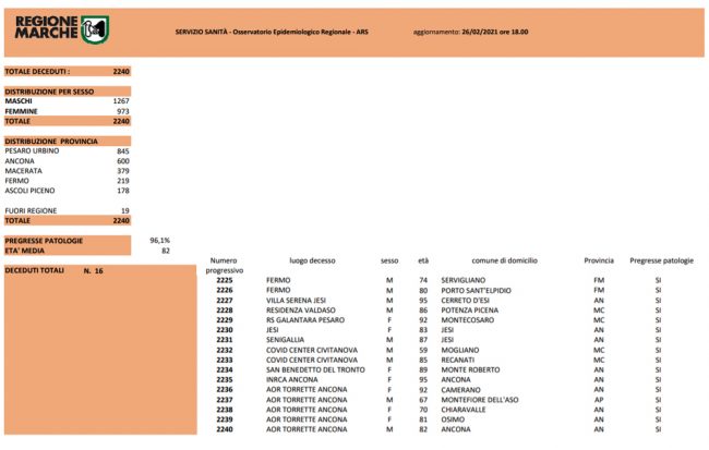 Sedici morti con il Covid nelle Marche. Tra loro ci sono 9 pazienti della provincia di Ancona. Si tratta di un uomo di 95 anni di Cerreto D’Esi, una donna di 83 anni di Jesi, un uomo di 87 anni di Jesi, una donna di 89 anni di Monte Roberto, una donna di 95 anni di Ancona, una donna di 92 anni di Camerano, una donna di 70 anni di Chiaravalle, una donna di 81 anni di Osimo e un uomo di 82 anni di Ancona. Altre 4 persone sono decedute nella provincia di Macerata, tra cui un 59enne di Mogliano ricoverato al Covid center di Civitanova, sempre al Covid center è morto un 85enne di Recanati, un uomo di 86 anni di Potenza Picena e una donna di 92 anni di Montecosaro. Le altre vittime nelle Marche ci sono un uomo di 74 anni di Servigliano, un uomo di 80 anni di Porto Sant’Elpidio e un uomo di 67 anni di Montefiore dell’Aso. Tutti avevano patologie pregresse, secondo quanto indicato dal Bollettino del Servizio sanità della Regione. Nelle Marche salgono a 2.240 le persone che sono morte con il Covid dall’inizio della pandemia (in regione il primo decesso col Covid risale al 2 marzo di un anno fa). Nel 96,1% dei casi erano persone che avevano delle patologie pregresse.