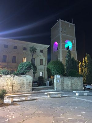 Osimo, la torre dell’acquedotto di Piazza Duomo illuminata dalla ‘luci rare’