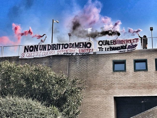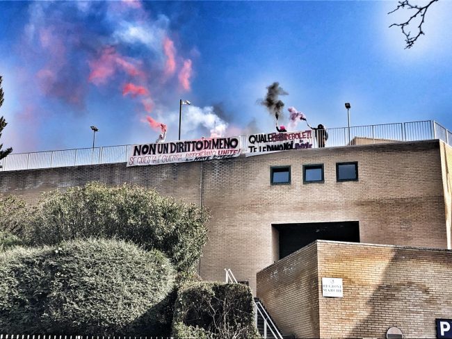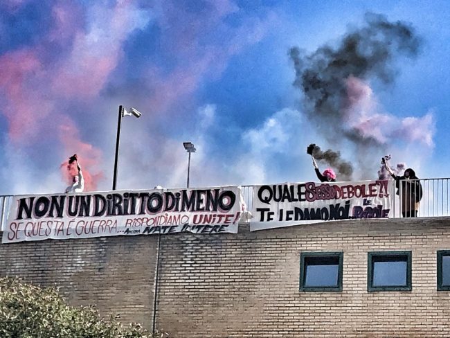 «Non un diritto di meno, se questa è guerra rispondiamo tutte». «Quale sesso debole, te le diamo noi le regole». Sono i contenuti dei due striscioni apparsi questa mattina a Palazzo Leopardi, nel quartier generale della Regione Marche, ad Ancona. A esporli, il collettivo transfemminista ‘Nate Intere’ di Ancona che ha voluto mandare un chiaro messaggio alle recenti dichiarazioni del consigliere regionale e capogruppo di Fratelli D’Italia Carlo Ciccioli, sulla famiglia naturale e sul ruolo del padre (che «detta le regole») e della madre (che «accudisce» i figli). «I diritti delle donne e il principio di autodeterminare il proprio concetto di famiglia sono parte della lotta che portiamo avanti da anni per tutelare la libertà di scelta sui nostri corpi». L’iniziativa di oggi lancia la settimana di mobilitazione regionale che porterà alla manifestazione del 6 marzo, ad Ancona, in piazza Roma.